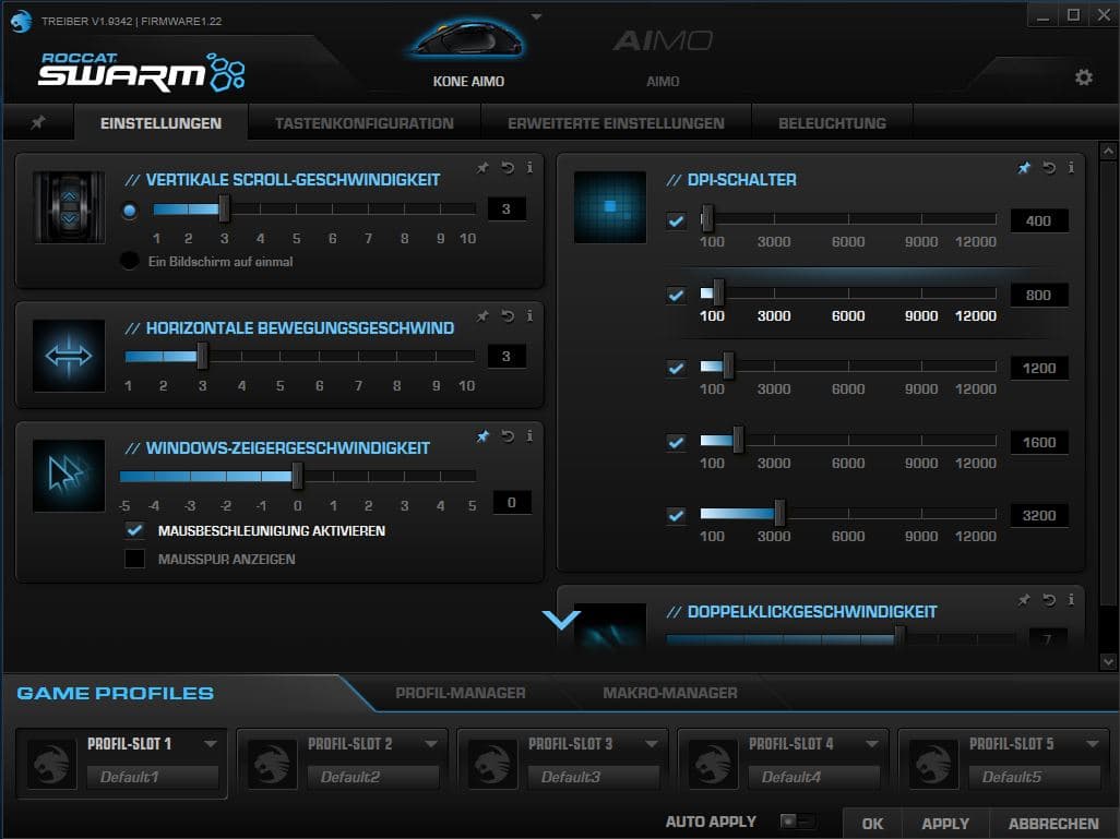 Selbstverständlich lässt sich auch die DPI-Empfindlichkeit anpassen. Der Standardbereich der Presets, die über die Schalter unter dem Mausrad erreicht werden, bietet allerdings nur fünf Stufen, die zunächst weniger als die Hälfte der maximalen Empfindlichkeit der Aimo abdecken. Mit einer maximalen Empfindlichkeit von bis zu 12.000 DPI kann die Maus also noch um einiges schneller abtasten. Die Presets können in der Software komfortabel nach den eigenen Wünschen angepasst werden.