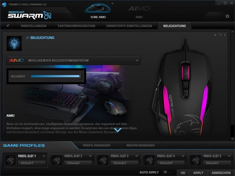 Eines der Highlights der Roccat Kone Aimo ist natürlich die RGB-LED-Beleuchtung, die ebenfalls per Software konfiguriert werden können. Es stehen Modi wie Welle, Schlängeln, Dauerbeleuchtung, Herzschlag 2.0, Atmen 2.0 sowie das intelligente Beleuchtungssystem Aimo zur Verfügung. Helligkeit, Geschwindigkeit sowie Farbdesign der Effekte lassen sich dann ebenfalls unkompliziert verstellen.