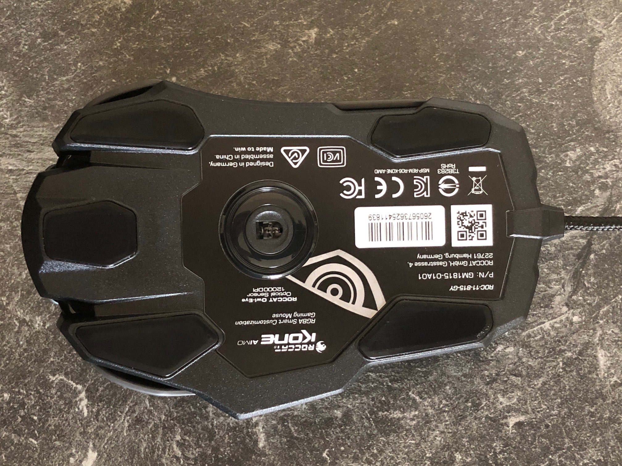Auf der Unterseite der Maus befinden sich fünf große Teflon-Mausglides, die für ein sanftes und gleichmäßiges Gleiten verantwortlich sind. Natürlich befindet sich hier auch der optische Owl-Eye-Sensor, der ein modifizierter Pixart PMW 3361 ist und den Untergrund per IR-LED abtastet. Die Abtastrate dieses Sensors liegt bei maximal 12.000 DPI, die in 100er Schritten an die Wünsche des Nutzers angepasst werden kann.