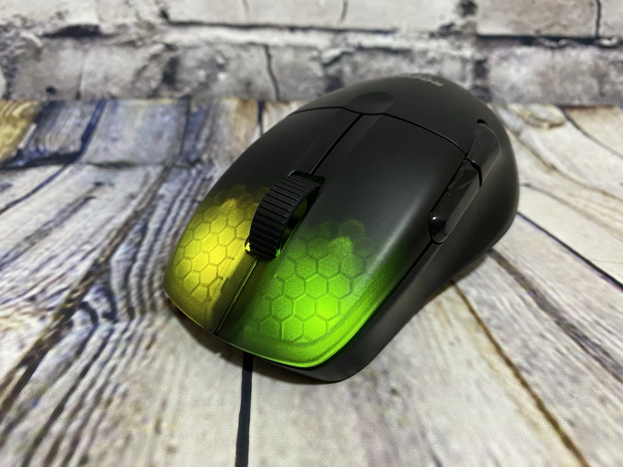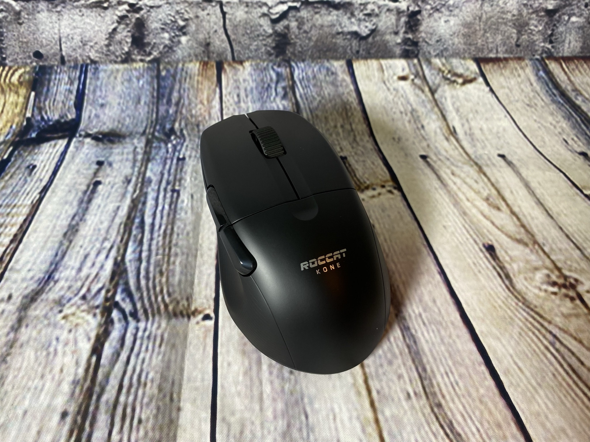 Für etwas mehr Grip an den Seiten sind dort die gummierten Seiten länglich geriffelt worden. Nicht zu tief, sodass sich dort auch kein lästiger Dreck ansammeln kann und gleichzeitig angenehm an der Haut. Zudem befinden sich an der linken Seite der Kone die mittlerweile zum Standard gewordenen seitlichen Maustasten – die Größe derer sollte für jede Anwenderhand passen. Zuletzt gibt es noch das Mausrad an der Oberseite der Maus. Hier wurde ein Titan Wheel Pro verbaut. Dieses wird aus stabilem Aluminium gefräst und übermittelt einen leisen taktilen Klick beim Drehen. Nach dem ersten Testen fühlt sich das Mausrad sehr angenehm an und macht uns damit wunschlos glücklich.