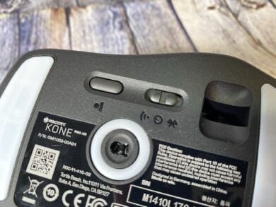 Auf der Unterseite der Kone Pro Air haben wir auch noch einiges zu entdecken – hier befinden sich nämlich zwei wichtige Schalter der Maus. Mit einem lässt es sich durch die angelegten Profile der Maus, welche wir später über die Software von ROCCAT ändern können, wechseln und mit dem anderen lässt sich der Konnektivitätsmodus der Maus einstellen. Schaltet man den Regler nach links, landet man beim WiFi-Modus. Gepaart mit dem mitgelieferten Wireless-Dongle wird hier eine 2,4-GHz-Verbindung aufgebaut. Schaltet man den Regler nach rechts, landet man bei der Bluetooth-Option, welche sich für einfache Office-Anwendungen eignet.