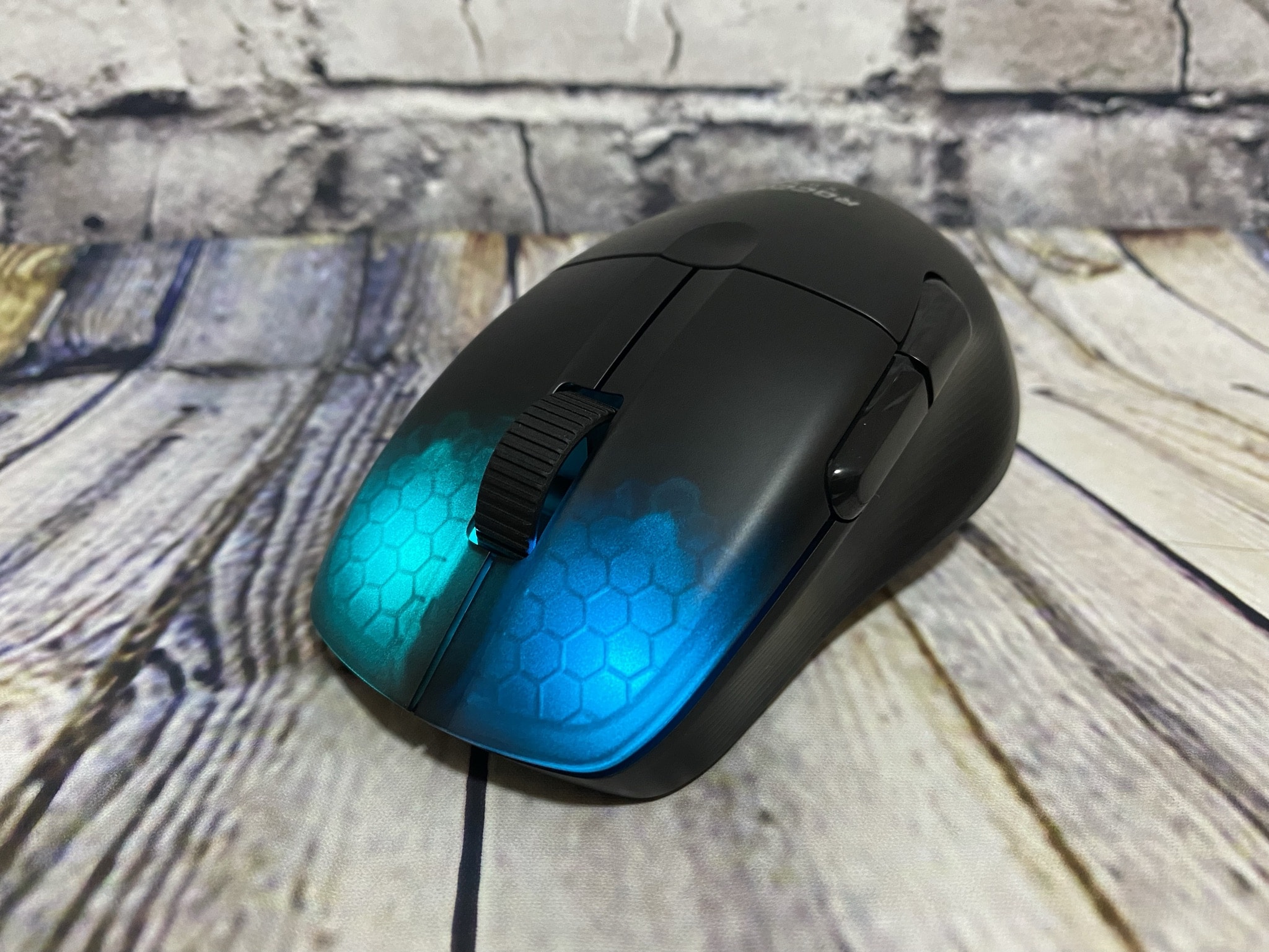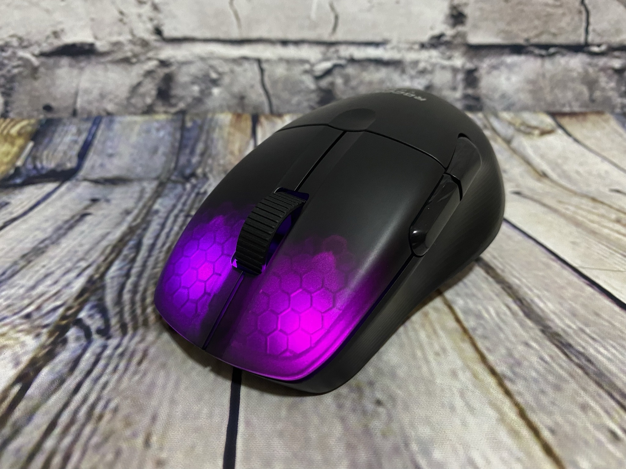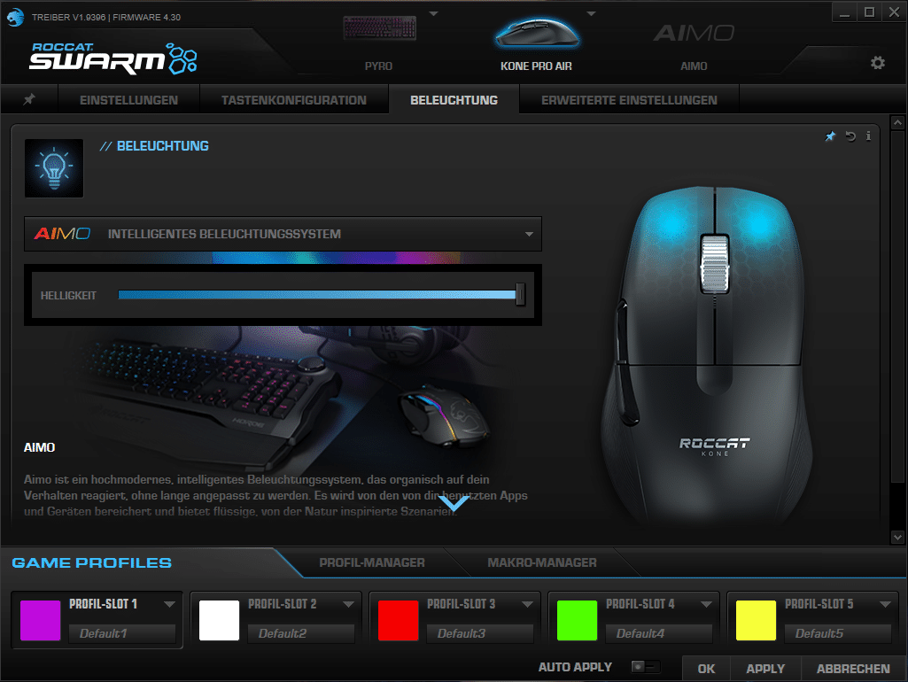 Seinem momentanen Kurs bleibt ROCCAT treu – das Warben-RBG-Design lässt sich hier bei der Kone Pro Air wieder mal finden. Verbaut ist sie dezent am oberen Rand der Maustasten und lässt sich mithilfe der SWARM-Software bearbeiten. Hierbei stehen uns die üblichen ROCCAT-Modi, wie das eigene AIMO-System oder weitere bekannte RGB-Modi zur Verfügung. Im Vergleich zu den neuesten Tastaturen wie auch Headsets ändert sich hier nicht viel. Die Farben sind sehr klar, gut hell und erzeugen einen schönen fortlaufenden Effekt.