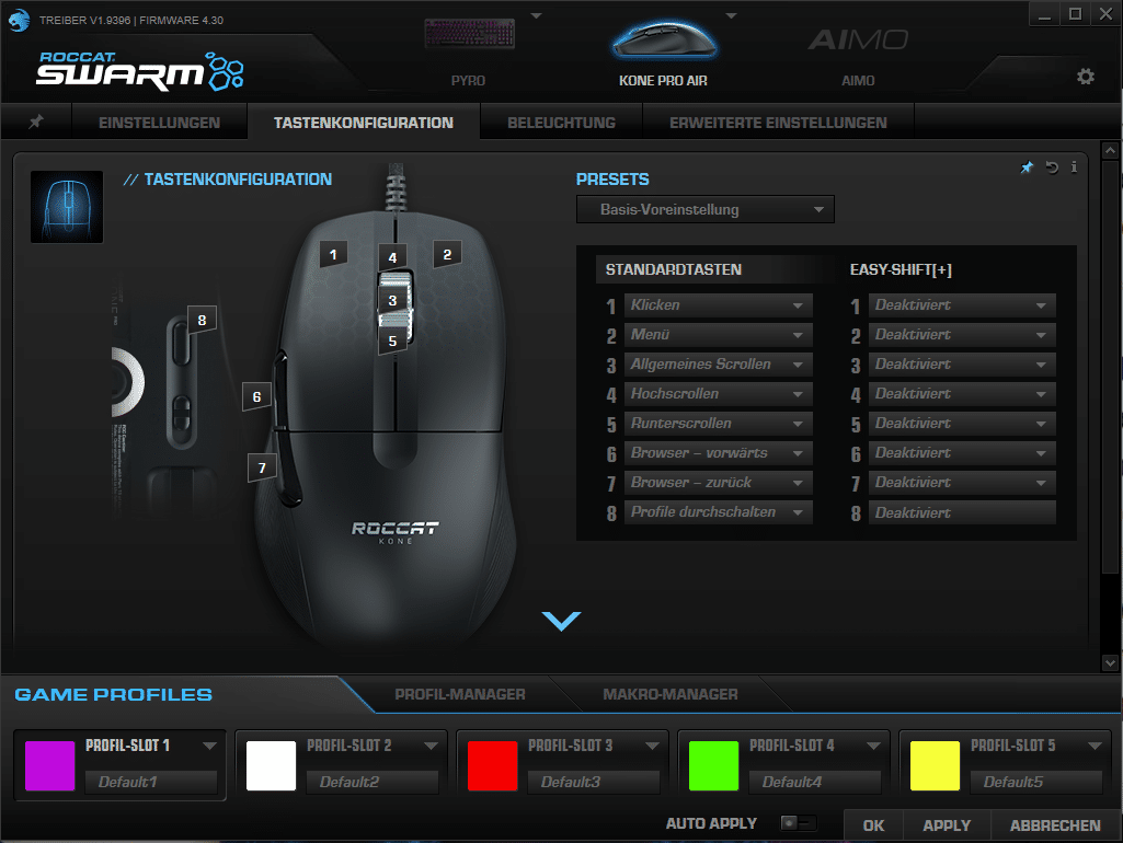 Außerdem lassen sich hier auch die insgesamt vier Maus-Profile konfigurieren. Hier geht es mit den üblichen Konfigurationsmöglichkeiten weiter. In den Profilen kann man die RGB-Beleuchtung, die DPI-Anzahl sowie die Makrotasten manuell konfigurieren. Die Software ist dafür übersichtlich genug, sodass man nach ein paar Sekunden schon den Dreh raus hat, auf welche Punkte man klicken muss.