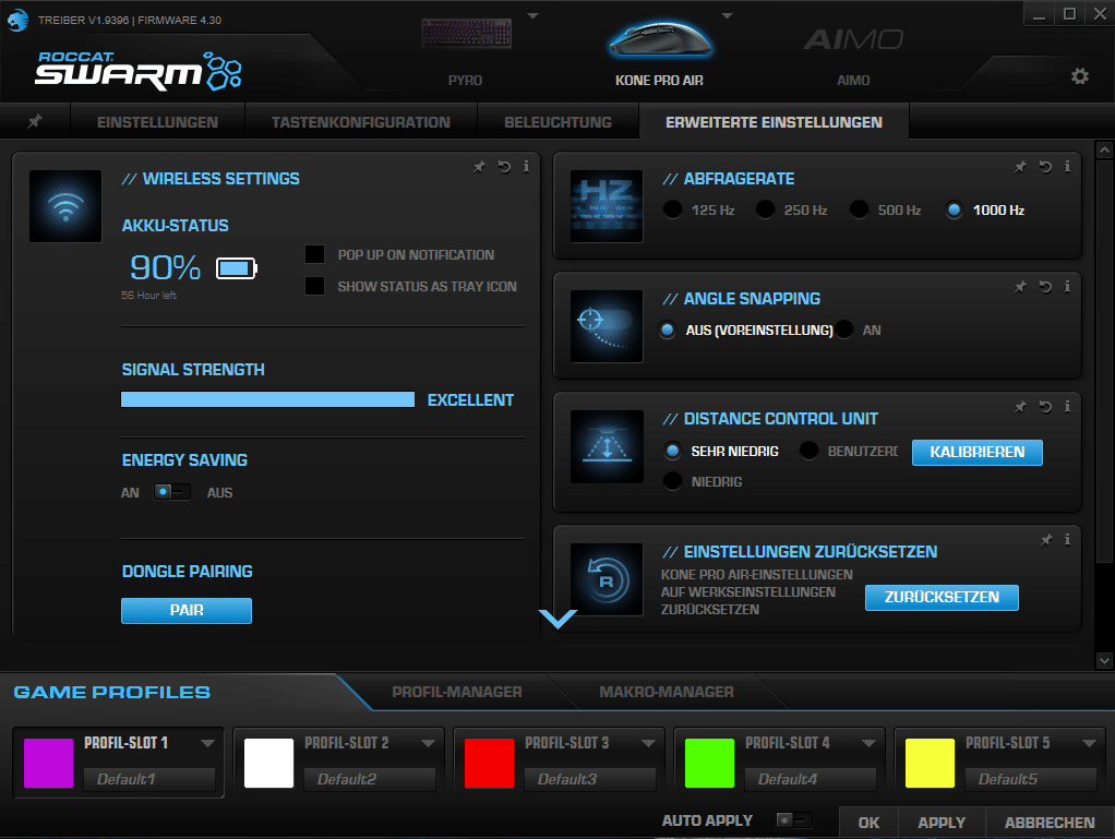 Außerdem hat uns die dezente RGB-Beleuchtung überzeugt. Das einfache Warbenmuster, welches wir bei der Roccat Burst Pro zum ersten Mal gesehen haben, macht auch hier bei der Kone Pro Air einen eleganten Eindruck. Softwareseitig lässt ROCCAT mit SWARM wieder nichts liegen. Alle Features sind eindeutig und einfach zu konfigurieren. Dem Gebrauch im Alltag steht somit nichts im Wege. Abschließend können wir nur unser Lob gegenüber der Kone Pro Air und ROCCAT aussprechen!