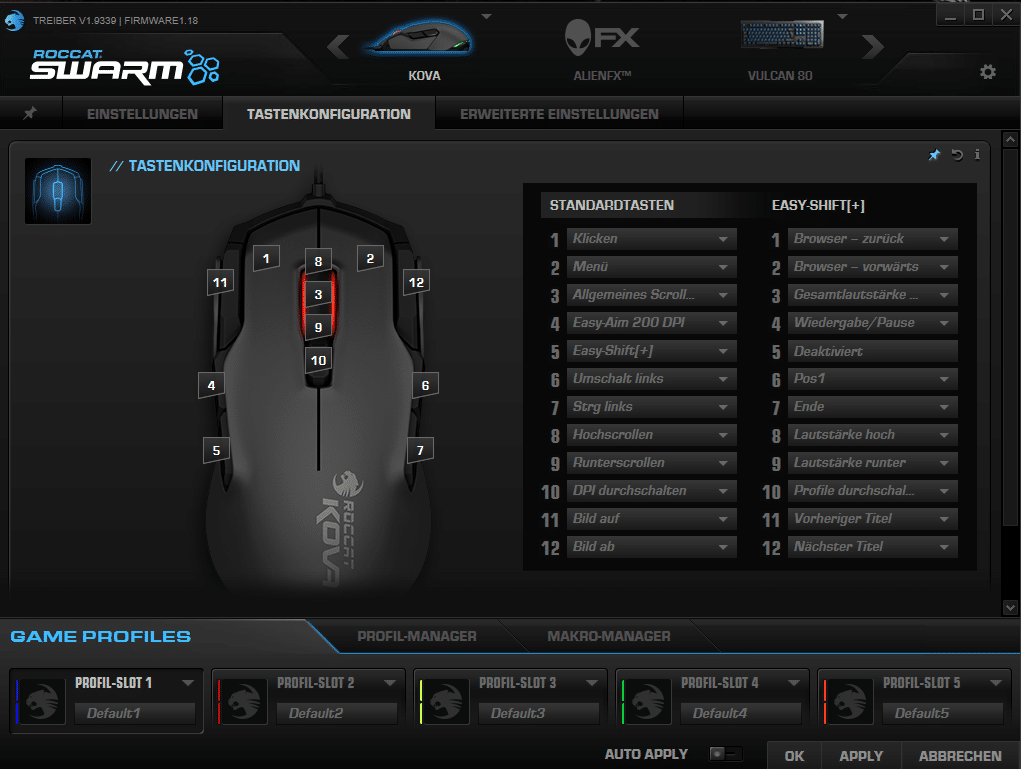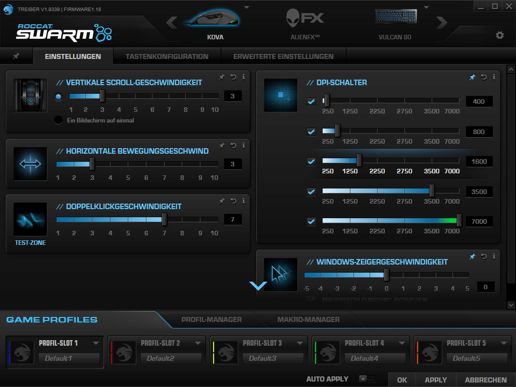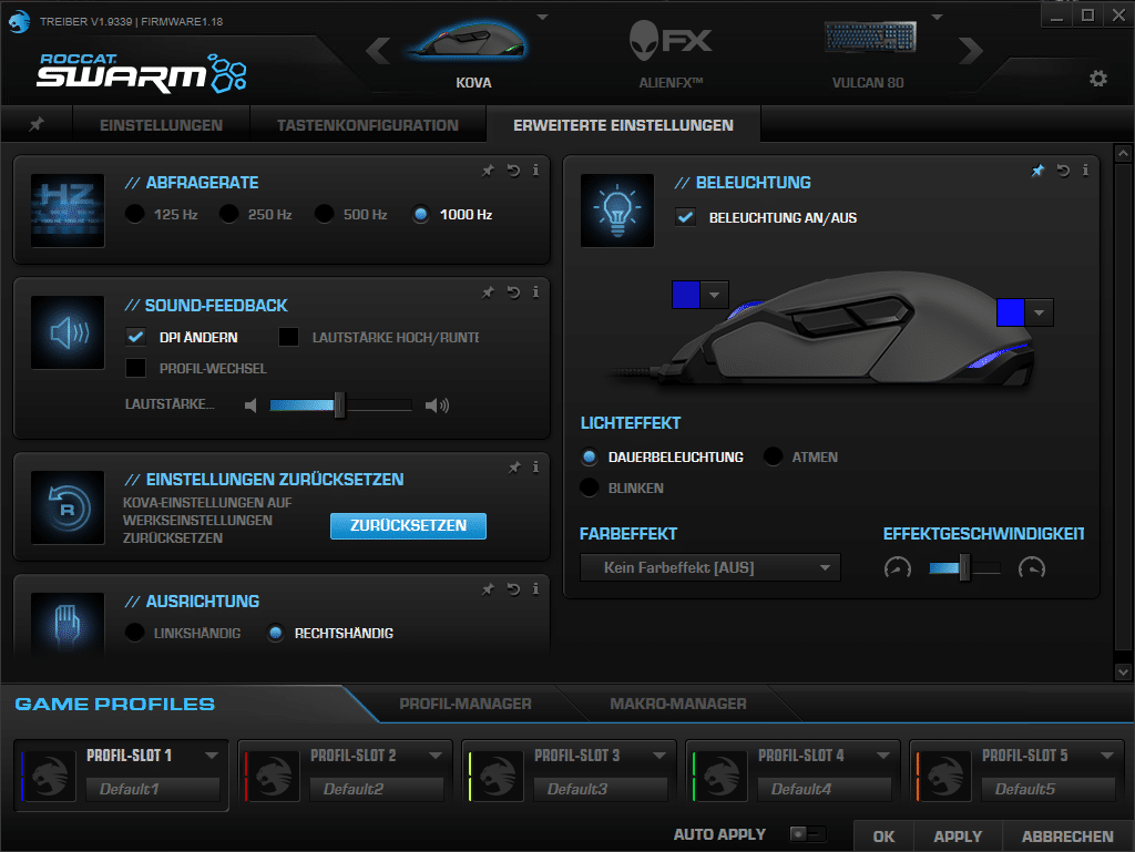 Die Tasten und die beiden RGB-LEDs der ROCCAT Kova lassen sich mit der ROCCAT SWARM-Software konfigurieren. Im Menüpunkt „Einstellungen“ werden die DPI-Geschwindigkeit, Mauszeigergeschwindigkeit in Windows und ähnliche Punkte abgehandelt. Unter „Tastenkonfiguration“ können die Tasten belegt werden und die Steuerung der RGB-LEDs sowie zusätzliche Einstellungen werden unter den „erweiterten Einstellungen“ festgelegt.