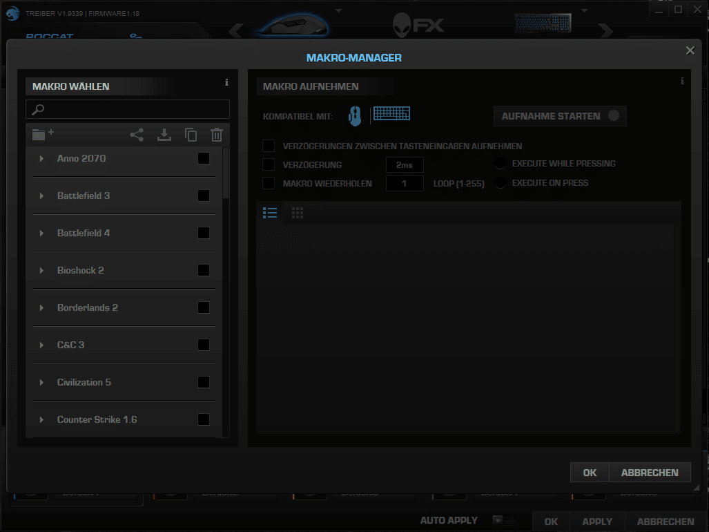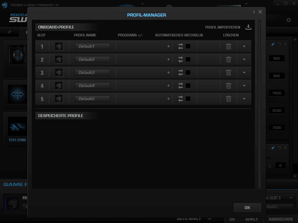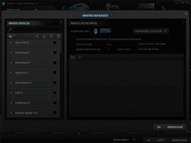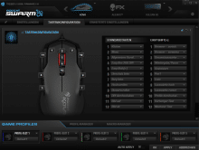 Im unteren Bereich der SWARM-Software werden die Spiele-Profile verwaltet. Hier können fünf individuelle Profile unter „Profil-Manager“ hinterlegt werden. Über den „Makro-Manager“ können aus dem Internet heruntergeladene Makros für diverse Spiele geladen oder eigene Makros erstellt werden.