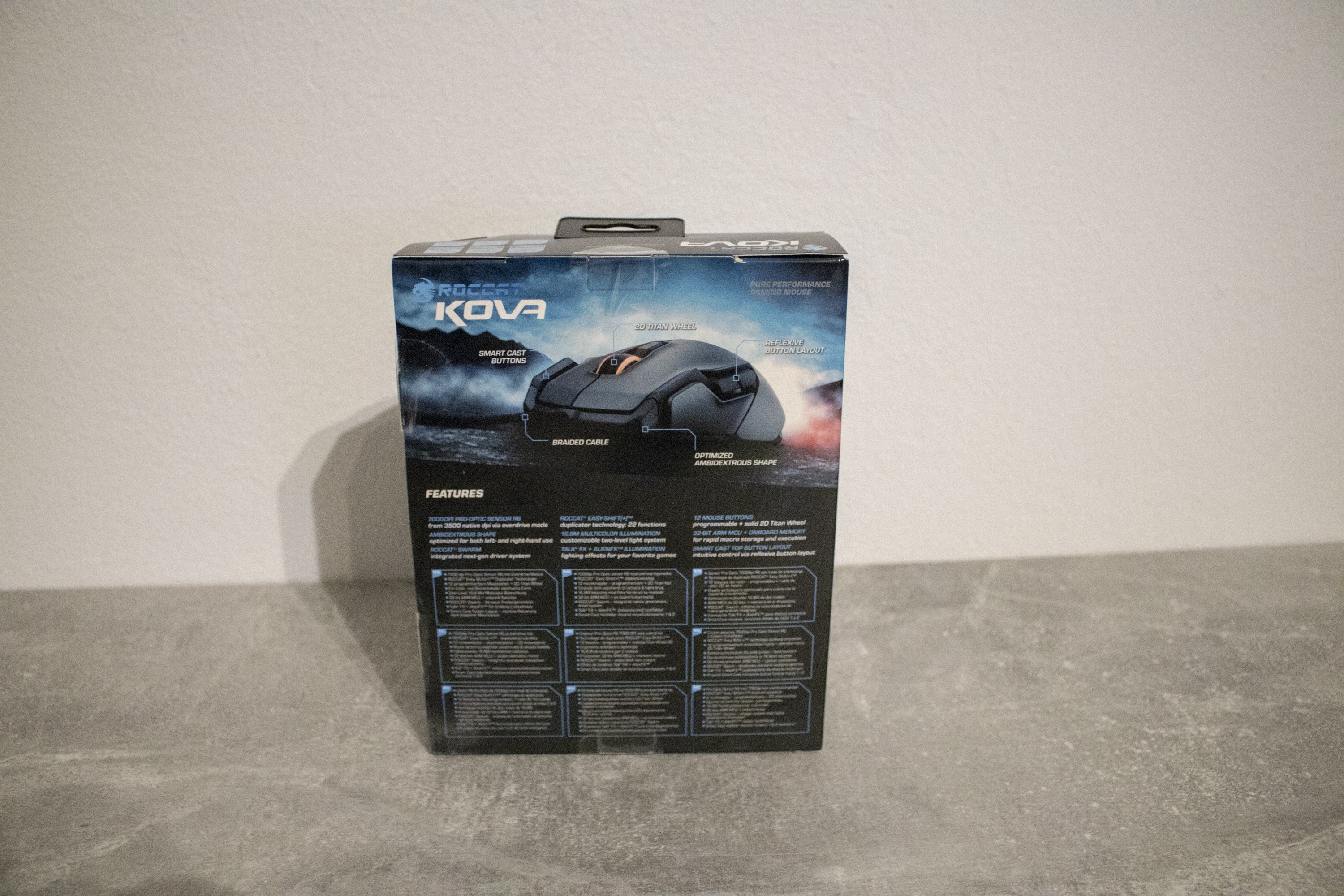 Der Pro Optic Sensor R6 der ROCCAT Kova bietet eine Auflösung von bis zu 7.000 DPI, kann aber auch in insgesamt fünf Stufen angepasst werden. Als Prozessor kommt ein 50 MHz Turbo Core V2 32-bit Arm zum Einsatz, die Abfragerate (Polling-Rate) beträgt 1.000 MHz und der interne Speicher ist 512 kB groß.