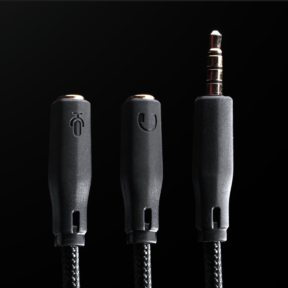 Das ROCCAT NOZ wird in einem schwarzen Umkarton verpackt, dem neben dem Gaming-Headset und der Dokumentation ein Y-Adapterkabel von 4-pol-3,5-mm-Klinke auf jeweils einen 3-pol-Klinkenstecker für Audio und Mikrofon.