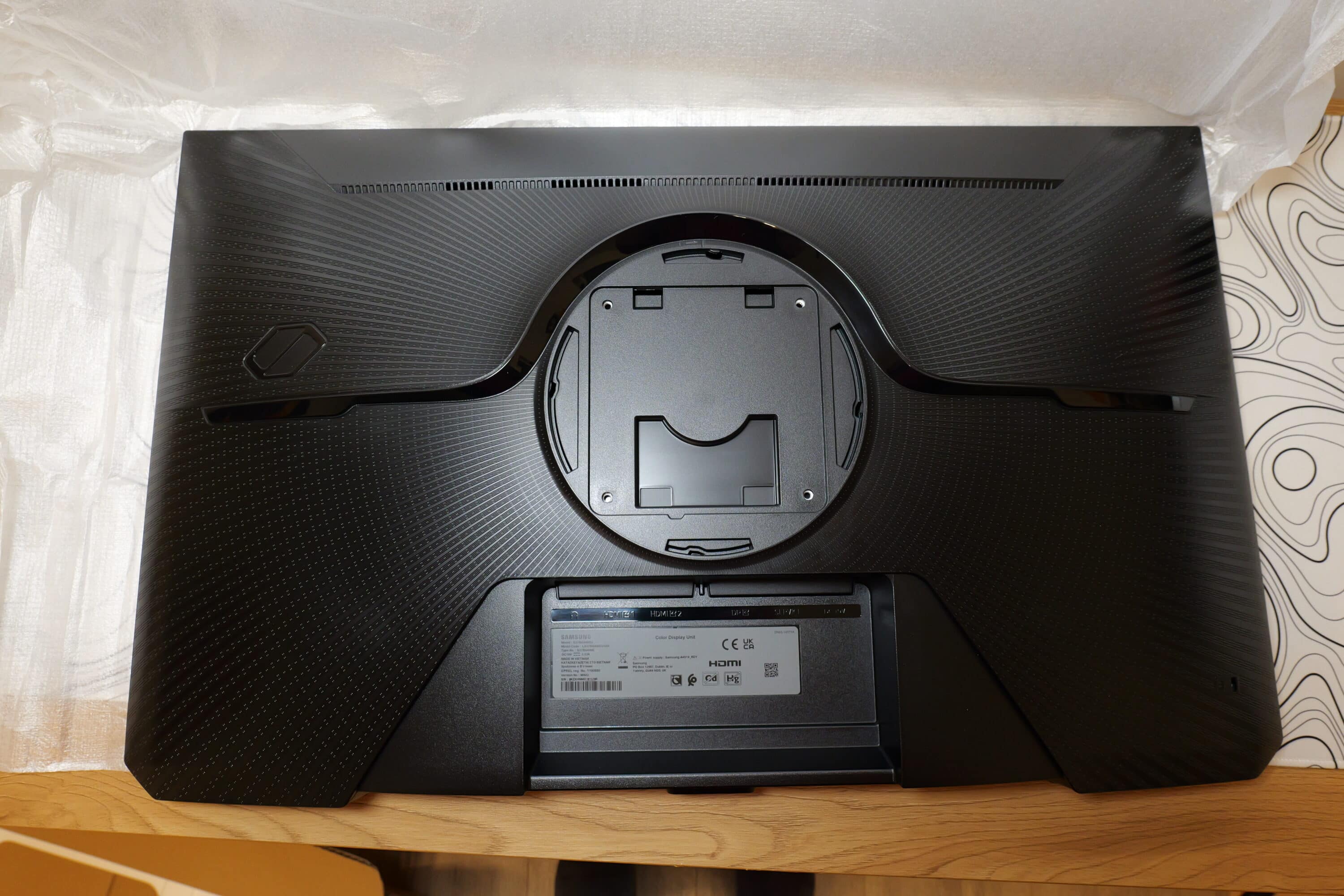 Damit wären wir auch schon bei der Anschlussauswahl des Samsung Odyssey G4 G4B, die recht überschaubar ausfällt. Das Panel findet ihr mittig an der Rückseite durch eine kleine Einbuchtung geschützt.