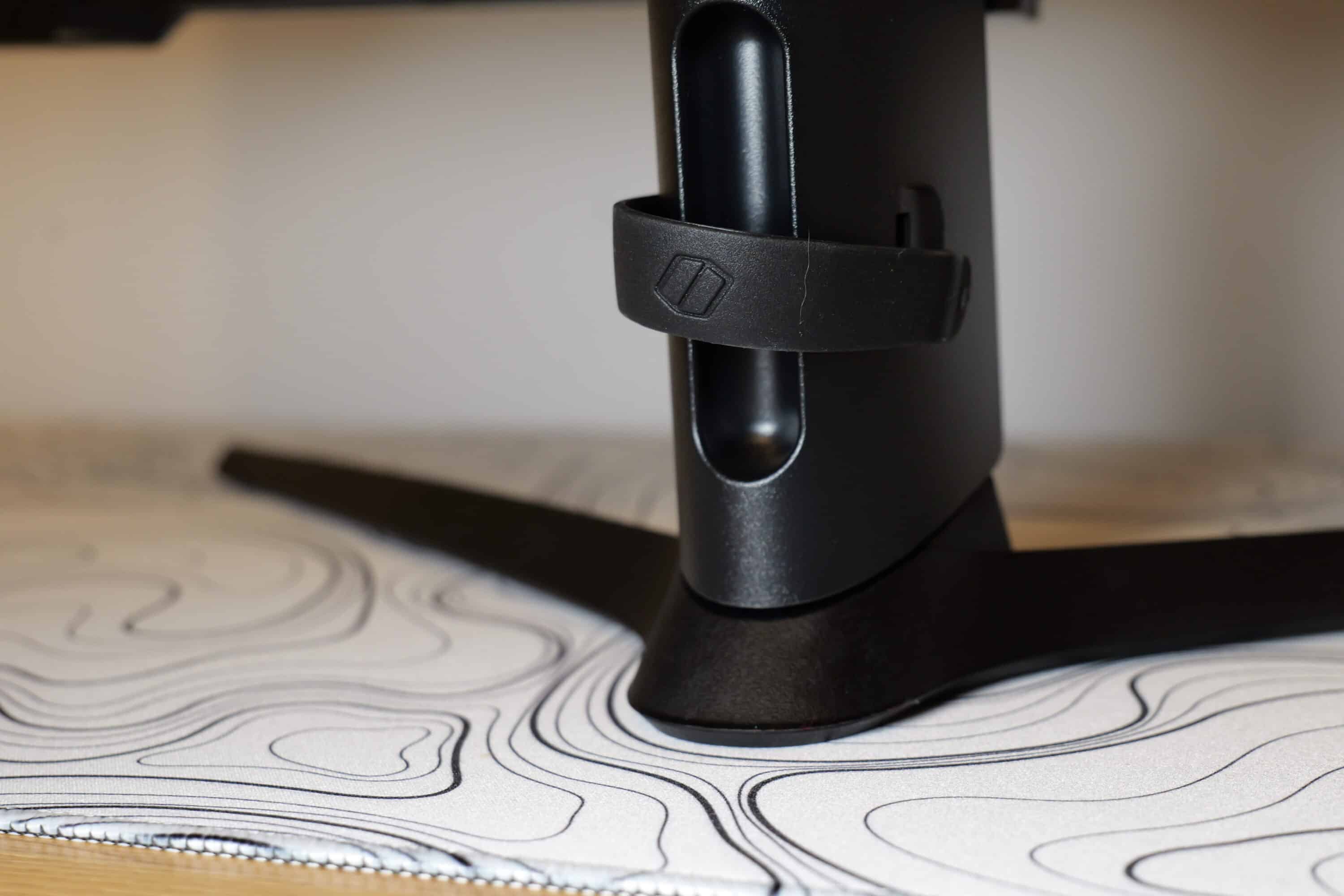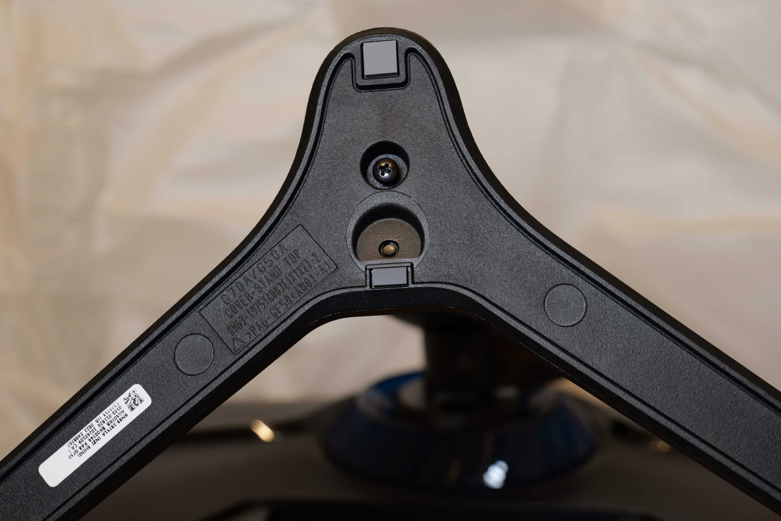 Die einzelnen Bestandteilen finden sich sicher verpackt im Lieferumfang. Die Halterung will dabei zunächst in die Rückseite des Monitors eingesetzt und dann mit dem Standfuß verschraubt werden. Letzterer liegt in V-Form vor und bietet mehrere Gummierungen an der Unterseite, damit der Monitor auf dem Tisch nicht verrutscht. Insgesamt ergibt sich eine Breite von 18 cm und Tiefe von 9 cm für den Standfuß, sicherer Halt ist also gewährleistet.