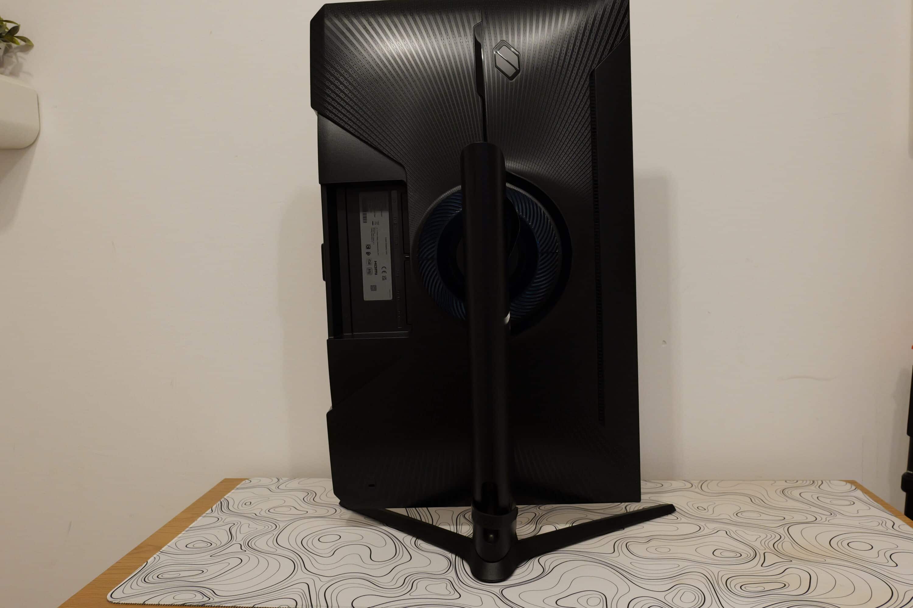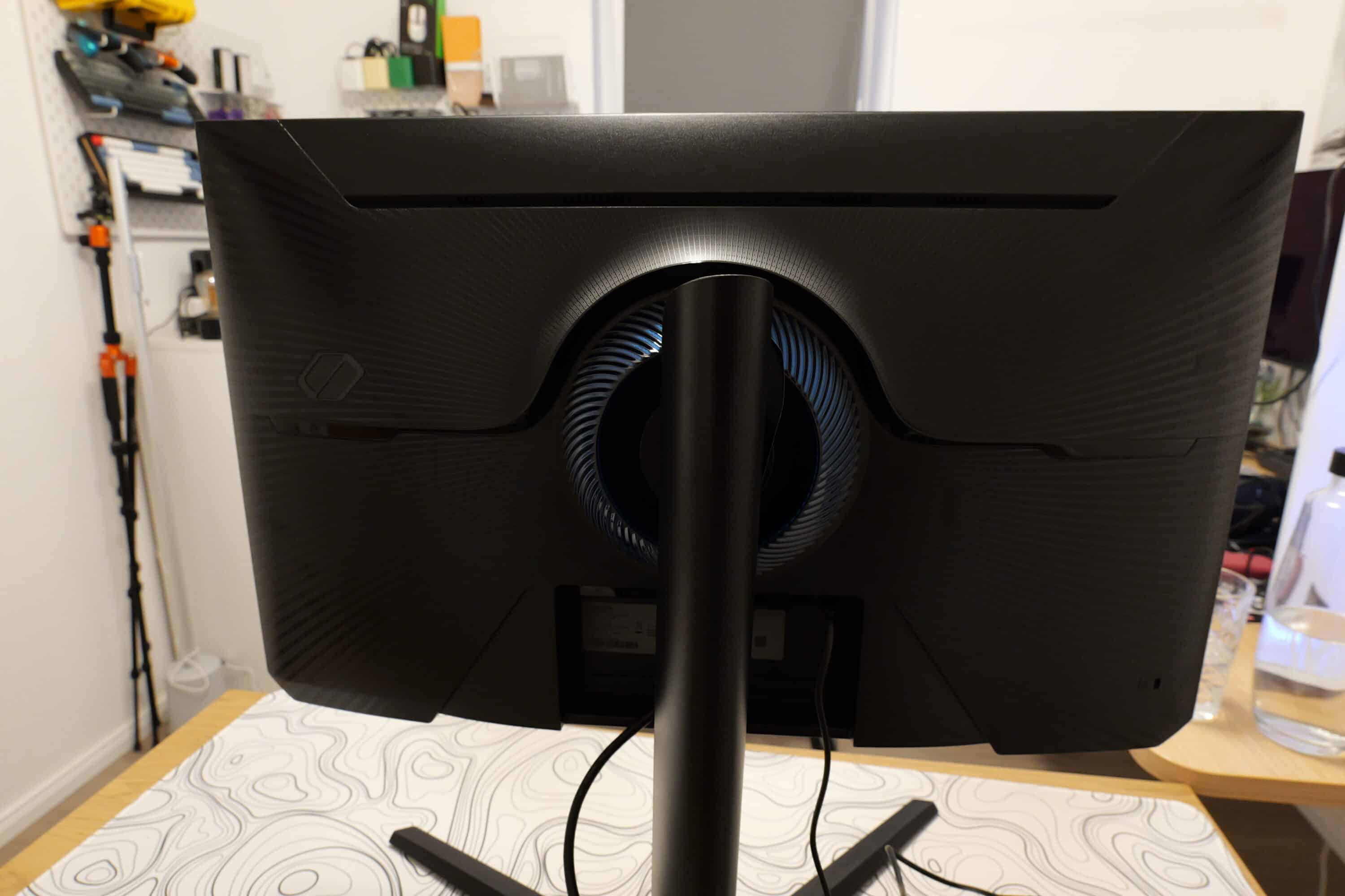 Beim Samsung Odyssey G4 G4B handelt es sich um einen eher schlichten, flachen Gaming-Monitor im 27-Zoll-Format, der auf ein dezentes schwarzes Kunststoffgehäuse setzt. Einen Farbakzent markiert der hellblaue Ring an der Rückseite, der – etwas enttäuschend – einfach aus zwei Kunststoff-Hälfen zusammengebaut und eingesetzt wird.