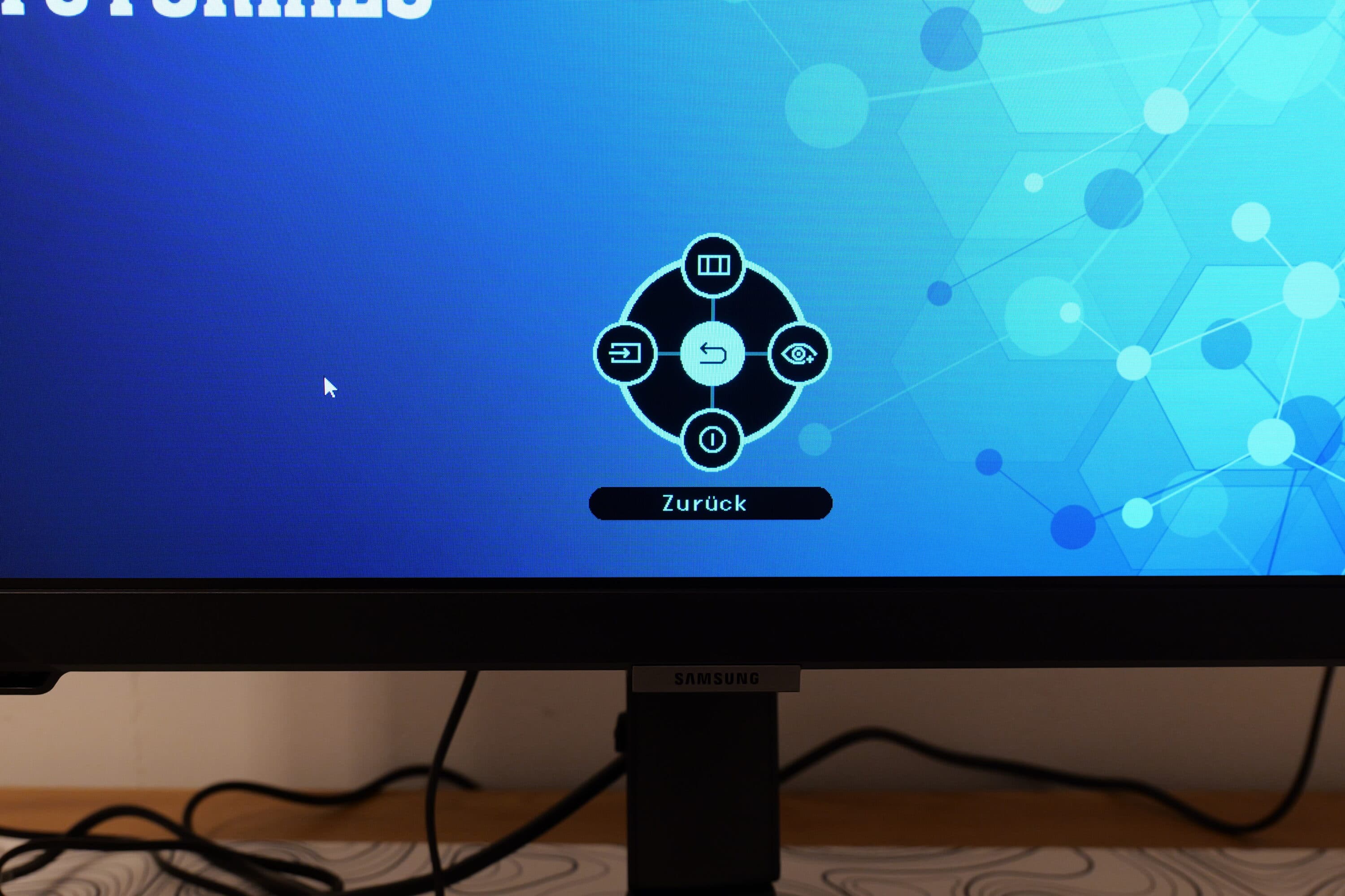 Die Bedienung des Samsung Odyssey G4 G4B erfolgt über ein Steuerkreuz, das ihr mittig an der Unterseite der Front (unterhalb des Herstellerlogos) finden könnt. Es verfügt über fünf dedizerte Tasten: Eine Power-Taste in der Mitte, sowie vier darumliegende Buttons, mit denen ihr durch die Menüs navigiert.