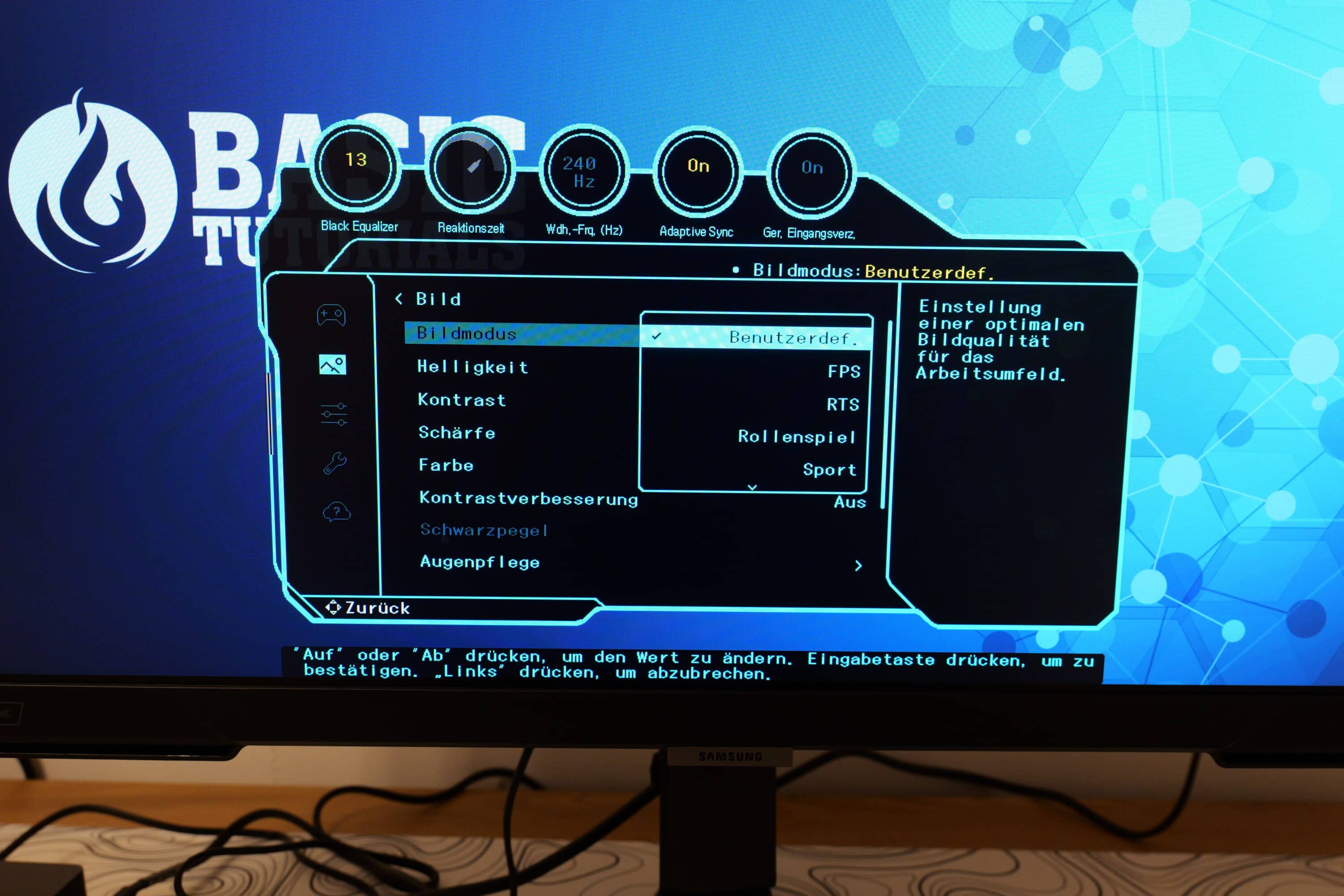 Das On-Screen-Display präsentiert sich angenehm übersichtlich und liefert in insgesamt vier Reitern die wichtigsten Einstellungen, was die Bildqualität, Helligkeit und Kontrast und viele weitere Parameter betrifft. Beim Bildmodus habt ihr die Wahl zwischen fünf Voreinstellungen (FPS, RTS, Rollenspiel, Sport und sRGB). Hinzu kommen ein benutzerdefinierter Modus und ein Modus mit hohem Kontrast.