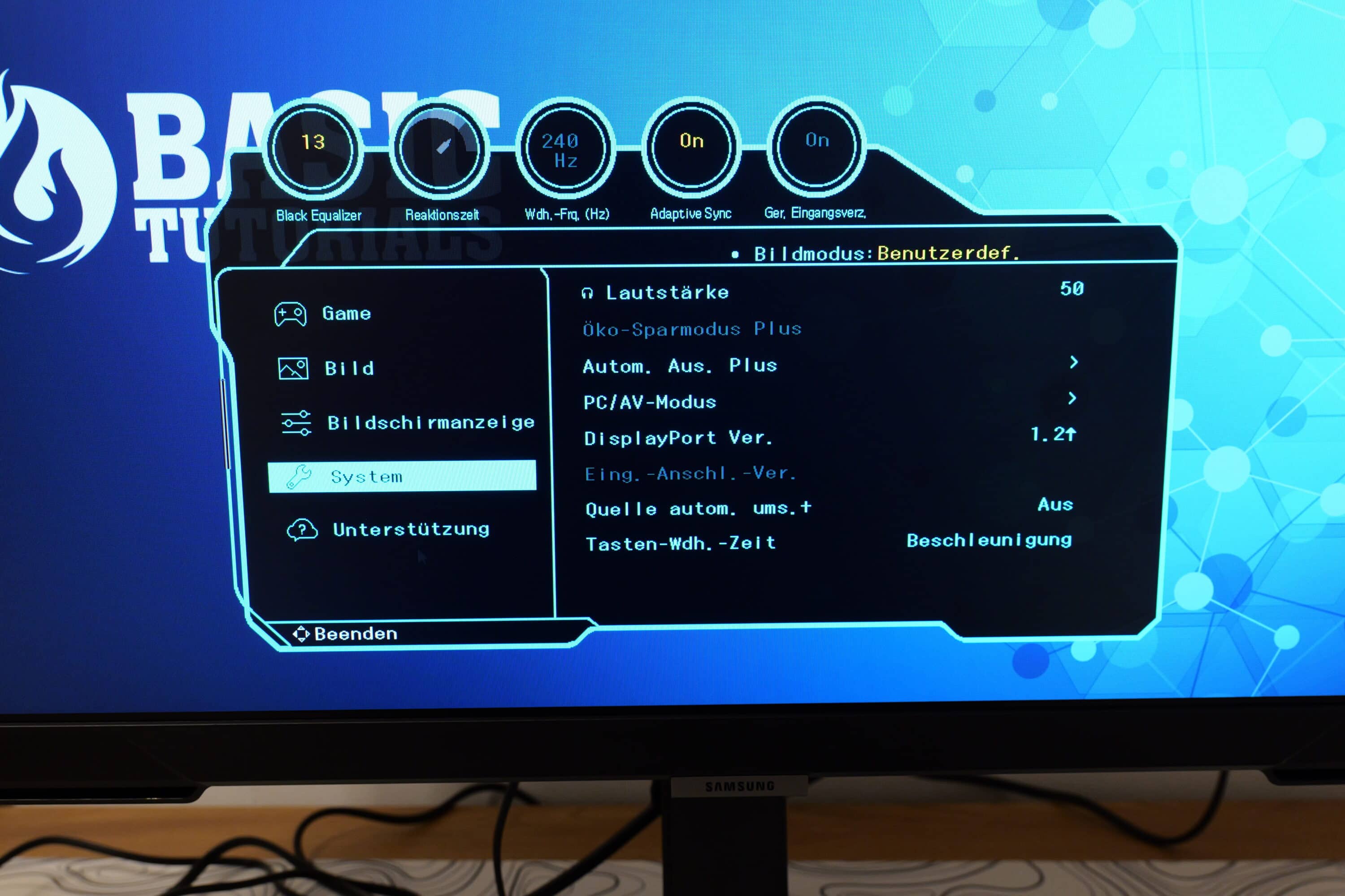 Hier stehen zwei HDMI 2.0-Anschlüsse, einmal DisplayPort und ein 3,5-mm-Klinkenanschluss zur Verfügung. Mehr gibt’s nicht. Aber immerhin: Sowohl HDMI als auch DisplayPort sind in der Lage, das Bild in vollen 240 Hz darzustellen.