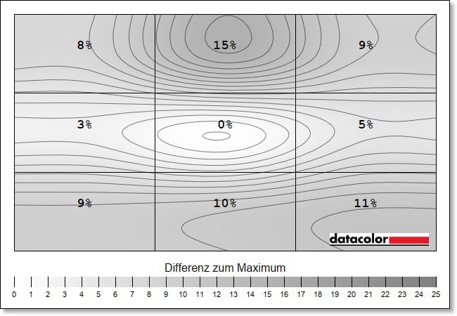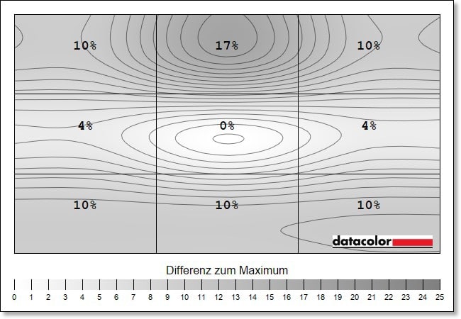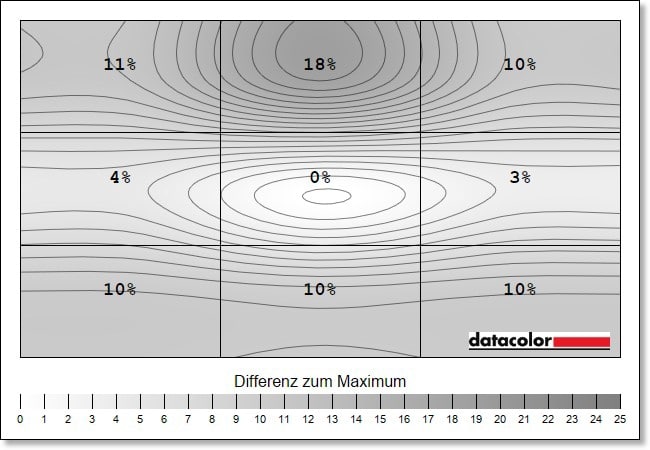 Hier kann die Luminanz-Homigenität (die Ausgeglichenheit der Helligkeitsverteilung) leider nicht mithalten. Die Abweichungen liegen mitunter bei bis zu 18 Prozent (bei 50 % Helligkeit, im oberen mittleren Rechteckt), was man dann mitunter schon deutlich sehen kann.