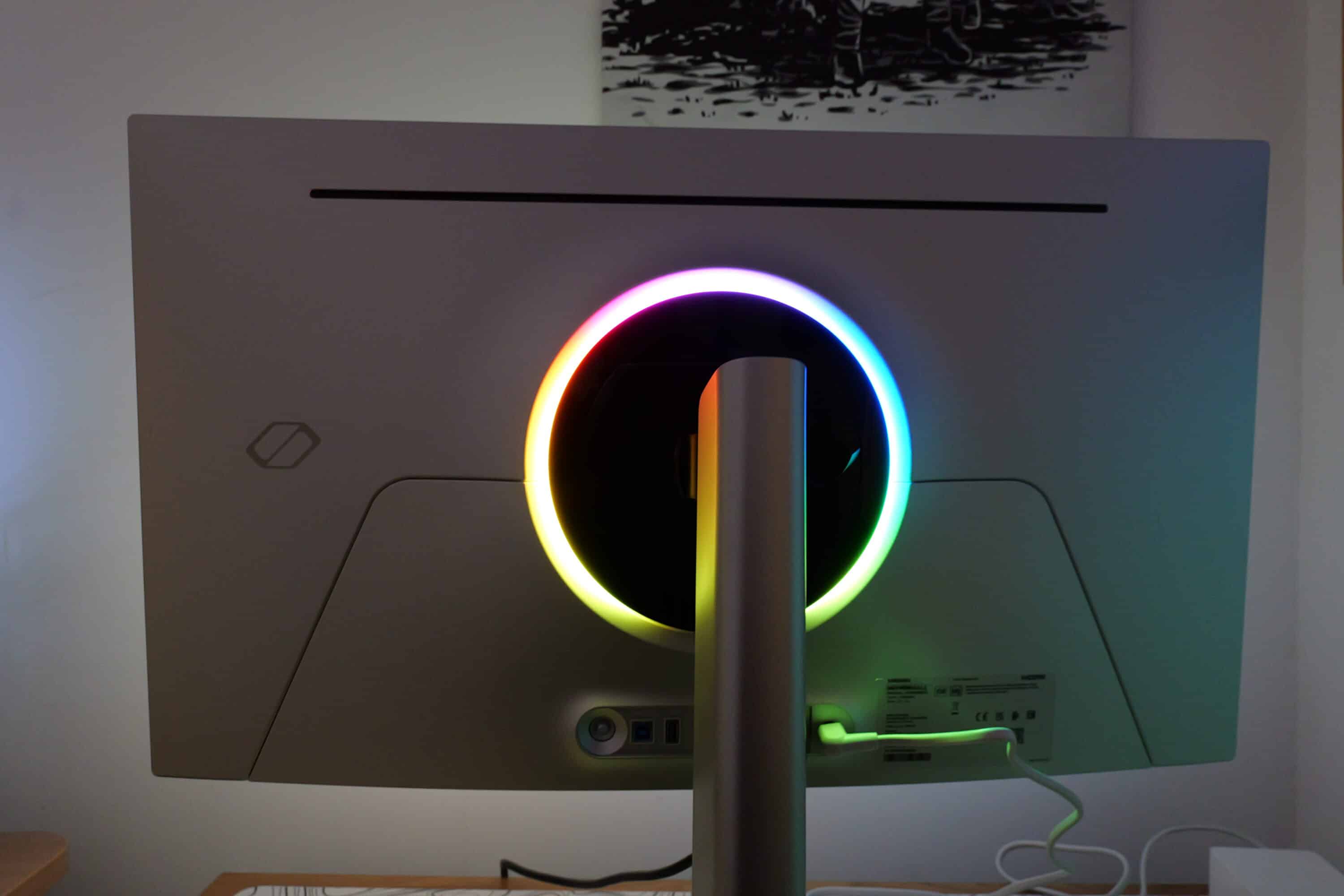 Natürlich wartet der Monitor auch mit einer ansprechenden und anpassbaren RGB-Beleuchtung auf, die sich – wie von Samsung bekannt – als Leuchtring um die Halterung an der Rückseite erstreckt. Die Beleuchtung lässt sich innerhalb des Menüs nach eigenem Wunsch anpassen.