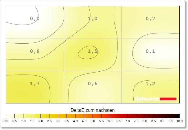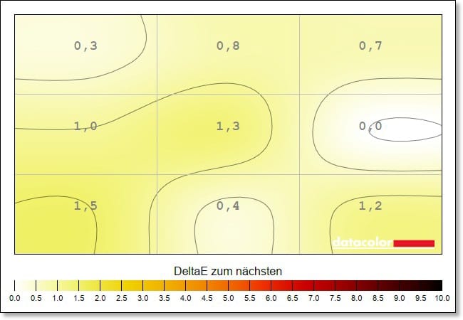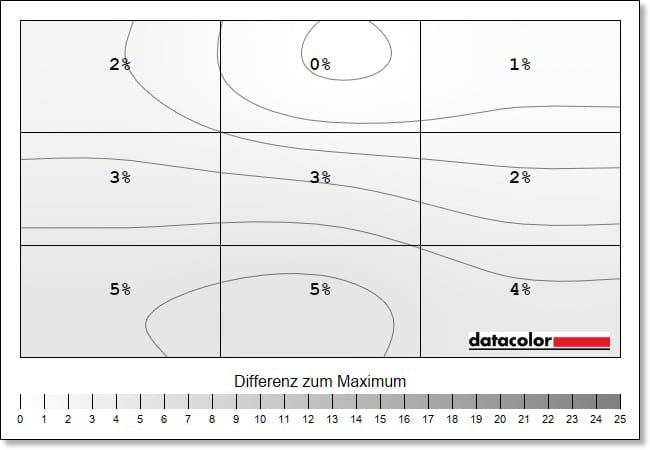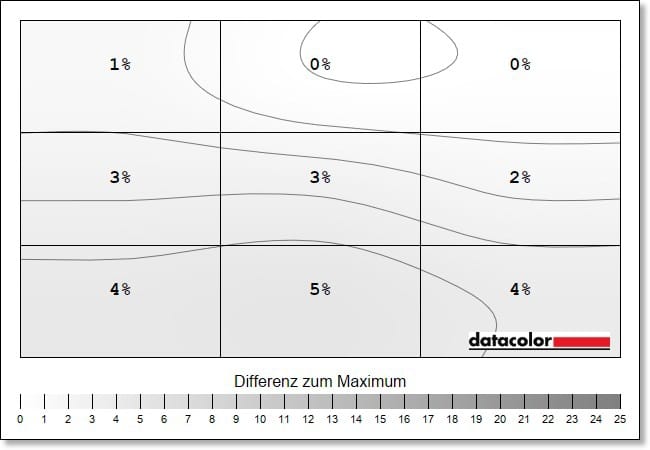 Auch die Luminanz-Homogenität, also die Ausgeglichenheit der Helligkeitsverteilung, liegt auf sehr gutem Niveau. Die Abweichungen liegen hier bei maximal 5 Prozent.