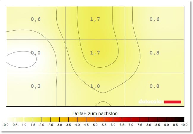 Sehr gut steht es zudem um die Farb-Homogenität, die die Ausgeglichenheit der Farbdarstellung beschreibt. Diese liegt, über alle Helligkeitsstufen hinweg, auf sehr gutem Niveau. Maximal zeigen sich Abweichungen von DeltaE 1,7 bei einer Helligkeit von 50 Prozent.