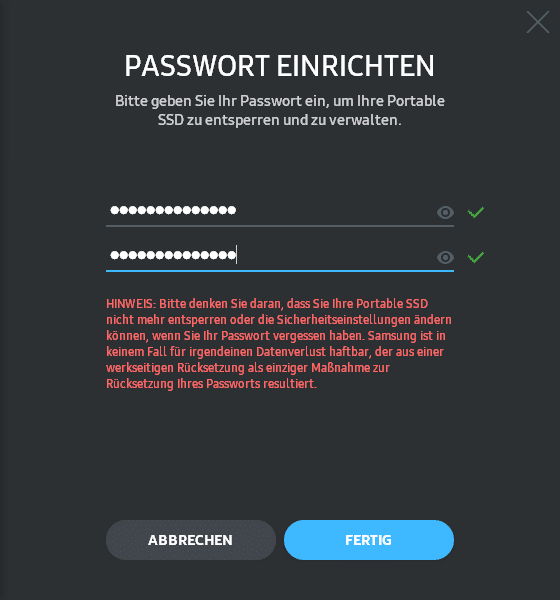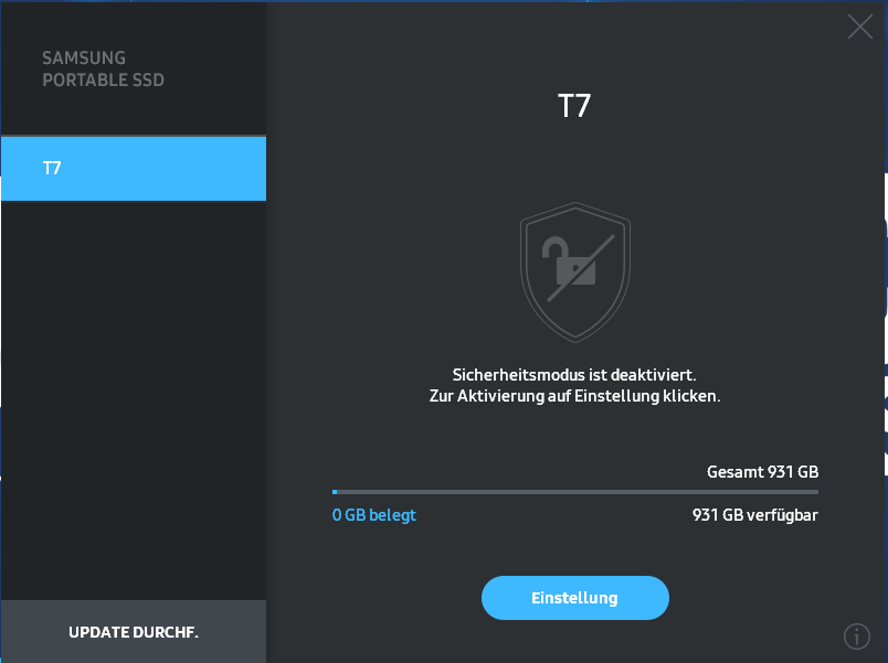 Der nicht vorhandene Fingerabdrucksensor der T7 Version ist jedoch, was die Datensicherheit an sich angeht, kein gravierender Unterschied. Mit Hilfe der entsprechenden Software ist es möglich seine Daten über ein Passwort zu schützen, wie euch die Bilderserie ganz einfach verdeutlicht. Ein Minimum an Sicherheit wird für das Passwort vorausgesetzt, daher müssen mindestens 4 Zeichen verwendet werden. Anschließend sind die Daten auf der Festplatte nach einer Verschlüsselung mit 256 Bit AES gesichert. So schnell kommt dann keiner mehr an eure Daten. Des Weiteren bietet die Software die Möglichkeit die Firmware der Samsung SSD T7 zu aktualisieren, sodass durch eventuelle Sicherheitslücken keine Risiken entstehen.