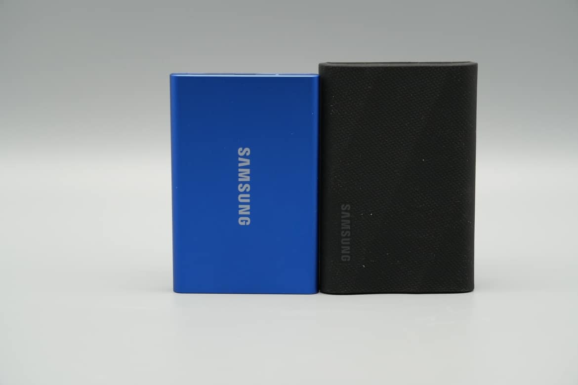 Insgesamt kommt die Samsung Portable SSD T9 auf eine Größe von 88 mm x 60 mm x 14 mm und das bei einem Gewicht von 122 Gramm. Wie der Vergleich zeigt, ist sie damit minimal größer, ein gutes Stück breiter und spürbar schwerer als die T7, fühlt sich aber auch entsprechend robust und wertig an.