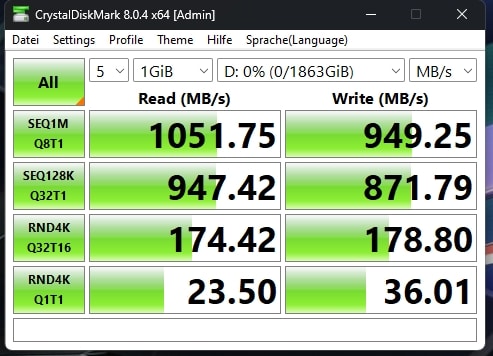 Beim Anschluss über einen normalen USB-C-Port verringert sich die Leistung laut CrystalDiskMark auf 1.051,75 MB/s lesend und 949,25 MB/s schreibend beziehungsweise 952,08 MB/s und 841,31 MB/s (AS SSD).