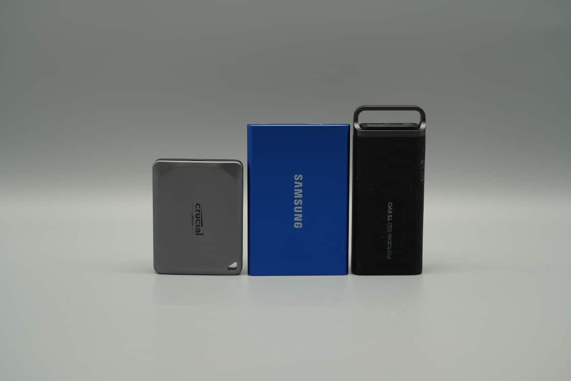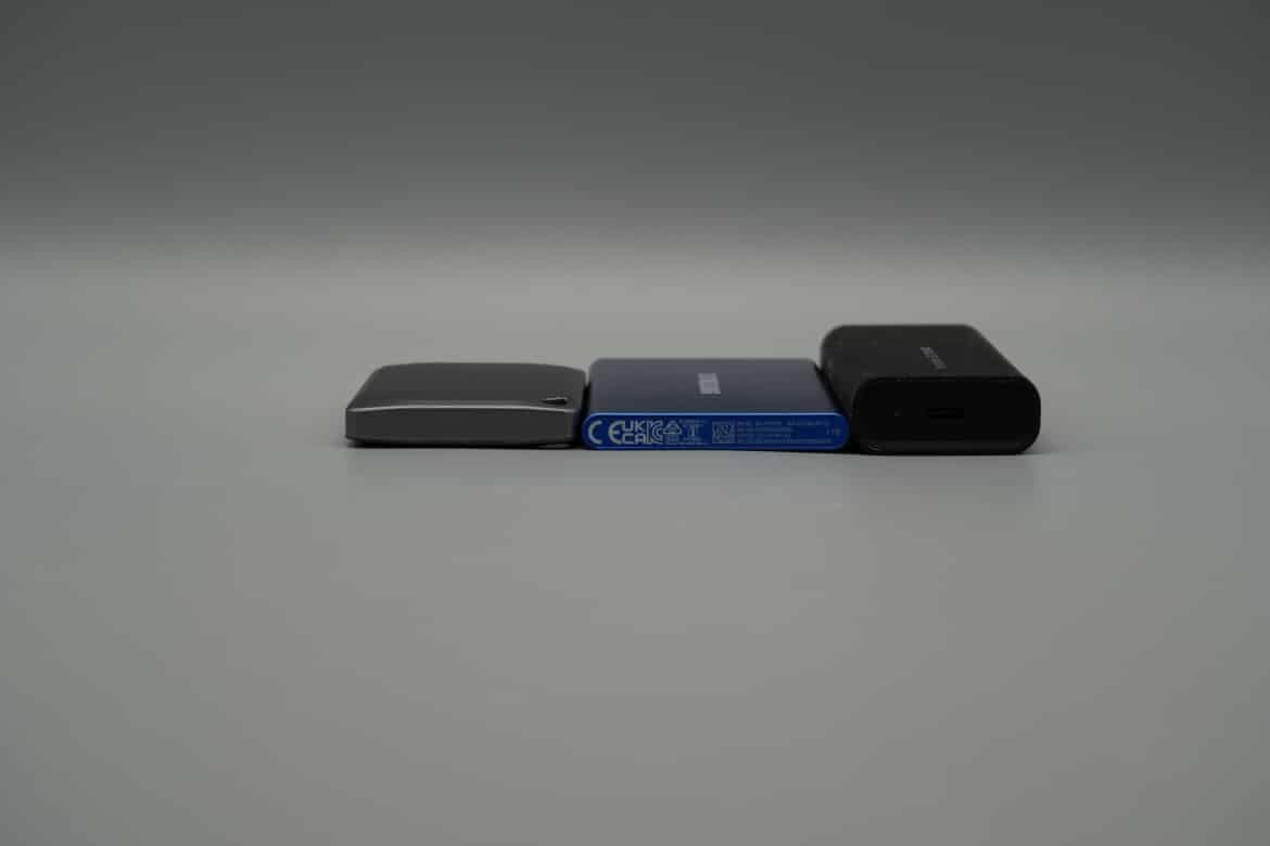 Das Gerät selbst ist 95 mm lang, 40 mm tief und 17 mm hoch und damit definitiv noch hosentaschenfreundlich. Der direkte Vergleich mit der Samsung T7 und der Crucial X9 Pro (unser Test) zeigt allerdings: es geht natürlich auch deutlich kleiner.