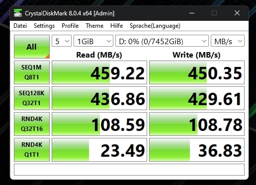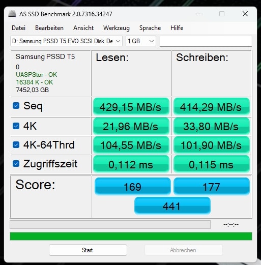 Der AS-SSD-Benchmark attestiert der T5 EVO 429,15 MB/s beim sequenziellen Lesen und 414,29 MB/s beim Schreiben. In CrystalDiskMark bewegen wir uns hingegen 459,22 MB/s lesend und 450,35 MB/s schreibend sehr nahe an der Herstellerangabe.
