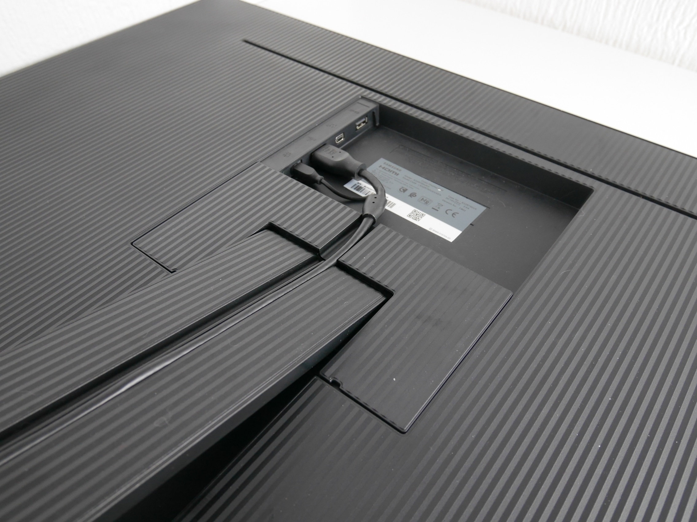 Auch bei der Kabelführung legt Samsung großen Wert auf ein ansprechendes Design und einen aufgeräumten Arbeitsplatz. Dazu sind in der Halterung zwei Kanäle integriert, durch die die Kabel von den Anschlüssen im Monitor unter den Tisch geführt werden können. Leider sind die Kabel während des Tests regelmäßig aus dem Kanal gerutscht, wenn der Monitor auf den Tisch heruntergeklappt wurde.