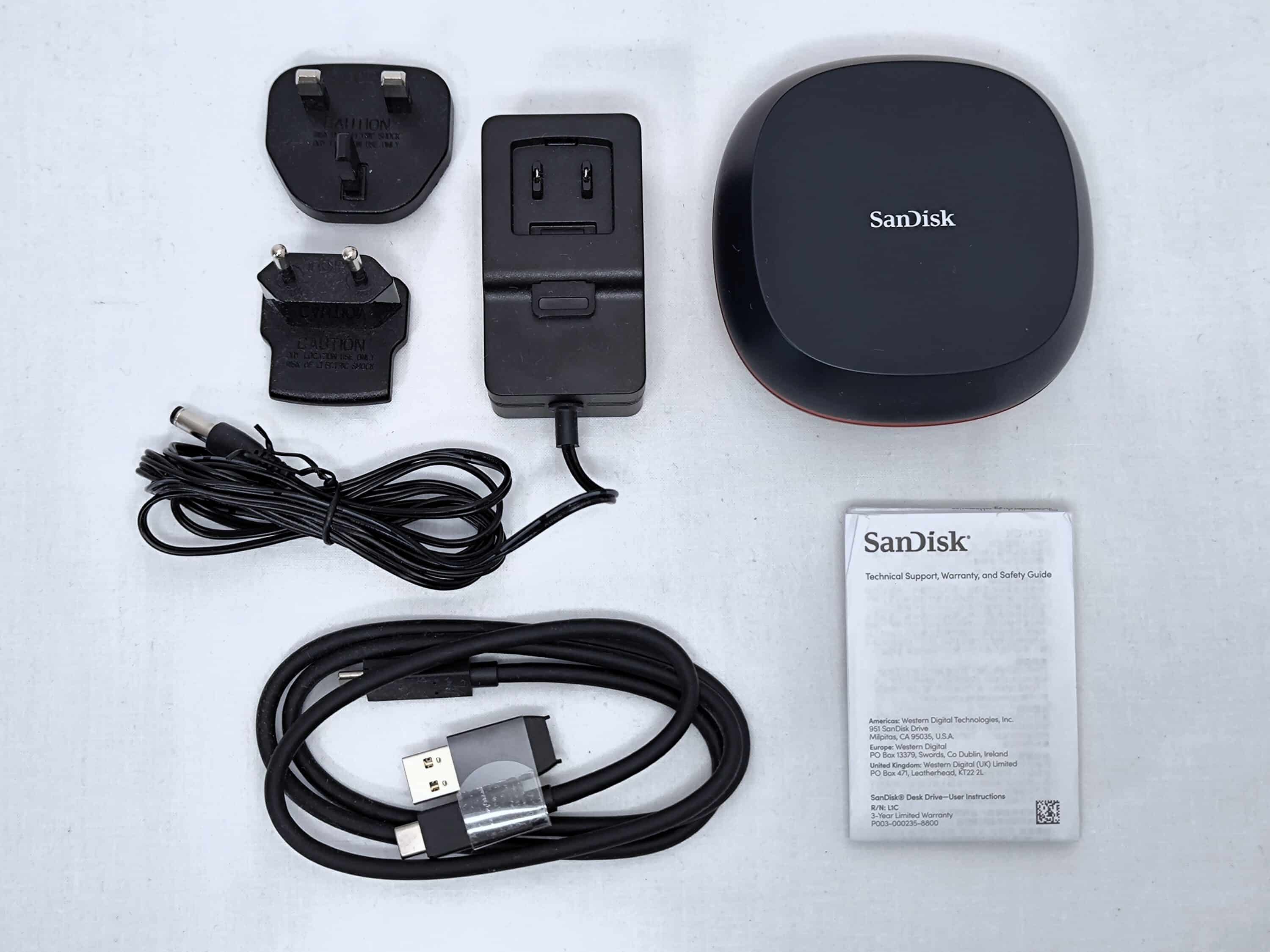 Die Verpackung der SSD kommt in der typischen Farbkombination des Herstellers daher, was einem Mix aus Weiß und Rot entspricht. Zum Lieferumfang der SanDisk Desk Drive zählen neben der SSD selbst sowohl ein USB-C-Kabel als auch ein Adapterstecker von USB-Typ-A auf USB-C. Ein Netzteil mit 18 Watt Leistung ist ebenfalls Bestandteil der Ausstattung und dient der Stromversorgung der SSD-Festplatte. Abgerundet wird das Paket durch ein kleines Benutzerhandbuch.