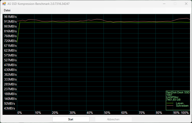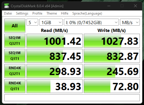 Im Test mit CrystalDiskMark zeigt sich, dass die SanDisk Desk Drive 8 TB ihre Übertragungsgeschwindigkeiten laut Datenblatt vollständig einhalten kann. Trotz mehrerer Durchläufe stellt sich ebenfalls heraus, dass die Schreibgeschwindigkeit bei diesem Benchmark sogar höher ausfällt als beim Lesen.