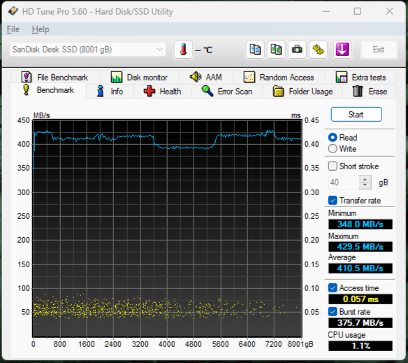 Im weiteren Testverlauf wurde die SanDisk Desk Drive 8 TB ebenfalls mit HD Tune Pro und ATTO Disk Benchmark getestet. Daraus ergibt sich folgendes Ergebnis:
