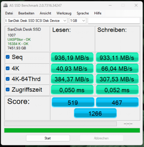 Mit Blick auf den AS SSD Benchmark kann die SanDisk Desk Drive erneut punkten und erreicht eine konstant hohe Performance. Die Zugriffszeiten liegen bei durchschnittlich 0,051 ms, was für eine externe SSD ein solider Wert ist. Beim Kopier-Benchmark fällt auf, dass gerade bei ISO- oder auch Spiele-Dateien der Transfer sehr schnell erfolgt. Beim Programmtest ist die Transferrate mit ca. 235 MB/s allerdings nur halb so hoch. Dies ist jedoch bei SSDs und HDDs weit verbreitet.
