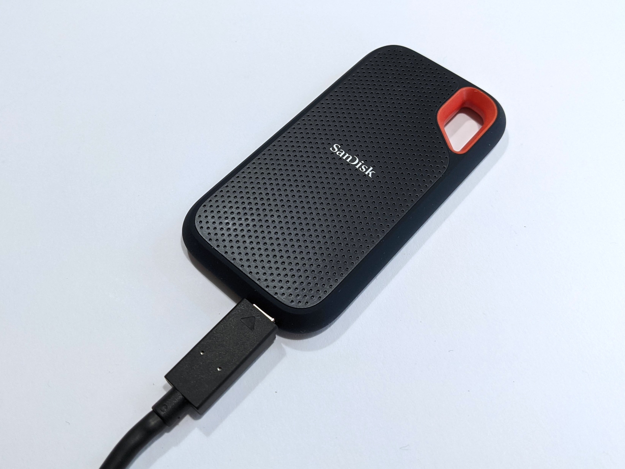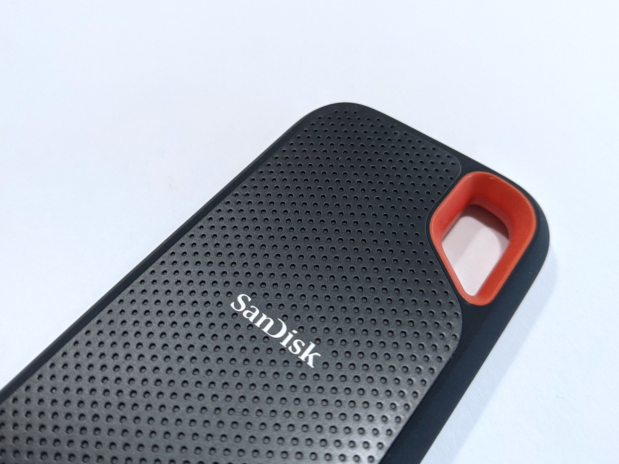SanDisk setzt bei Version 2 der externen SSD auf das altbekannte Gehäuse der ersten Version. Die Vorderseite besteht aus strukturiertem Kunststoff, mittig und damit gut sichtbar ist das silberne SanDisk-Logo platziert. Der orangene Ausschnitt in der oberen rechten Ecke, mit dessen Hilfe die SSD z.B. an einem Karabinerhaken in der Tasche oder am Rucksack befestigt werden kann, besteht ebenfalls aus Kunststoff. An den Seiten und auf der Rückseite des Gehäuses setzt man dagegen auf eine schwarze Gummierung. Die SSD liegt dadurch gut und sicher in der Hand, die Verarbeitung ist rundum sehr gut.
