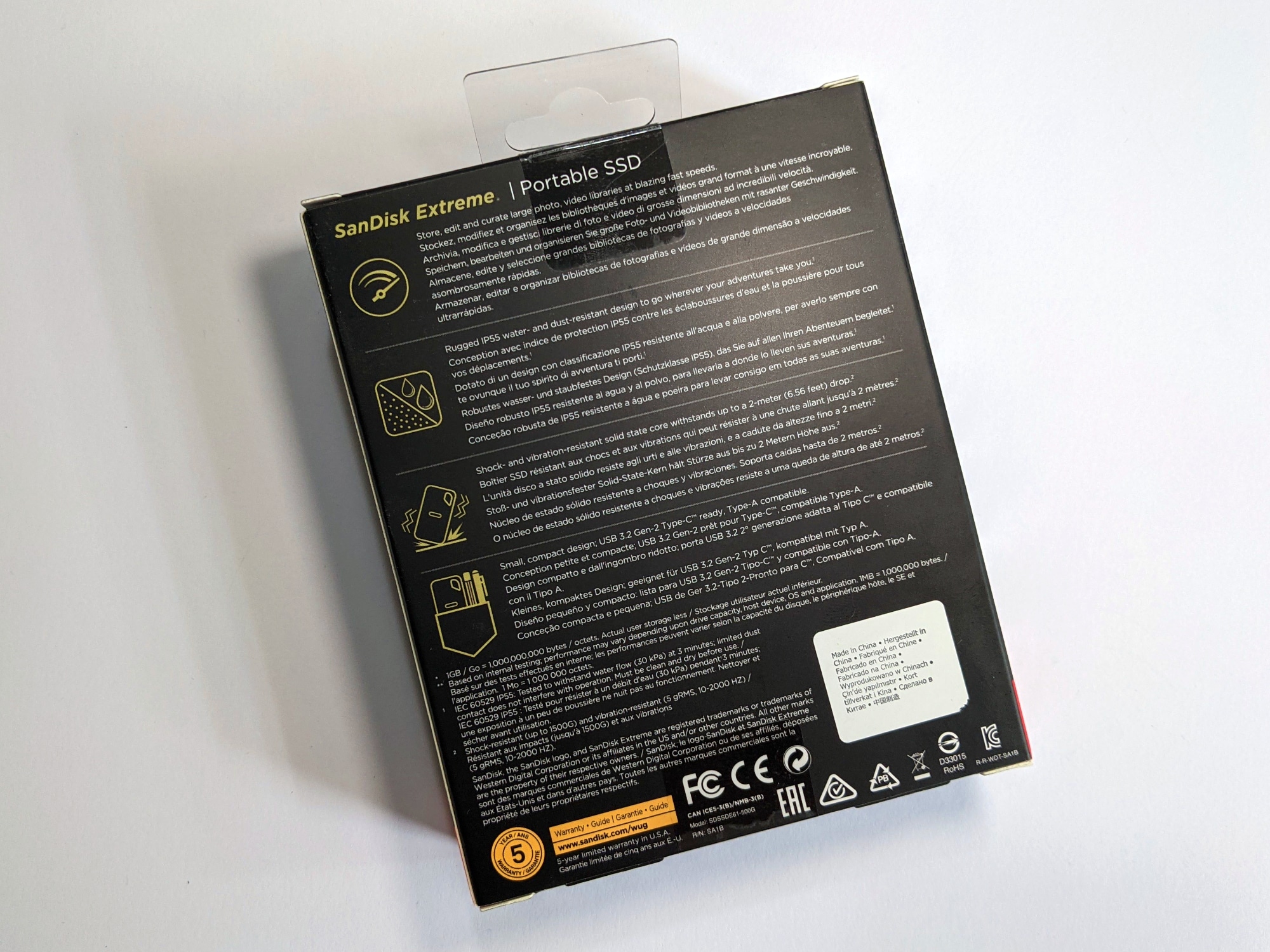 Eine Besonderheit des Gehäuses ist die Schutzklasse IP55. Diese Kennzeichnung besagt, dass die externe SSD für bis zu 3 Minuten unter fließendem Wasser dicht ist und sich auch der Kontakt mit Staub nicht auf den Betrieb auswirkt. Dies bedeutet nicht, dass man die SSD unter Wasser tauchen darf, ist allerdings praktisch, wenn man einmal ein Getränk verschüttet oder unterwegs in starken Regen gerät. Wenn die SSD wirklich einmal nass wird, dann solltet ihr sie vor dem Einsatz dennoch säubern und trocknen. Weiterhin wirbt SanDisk mit einer Fallsicherheit aus bis zu zwei Metern Höhe.