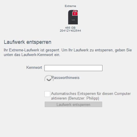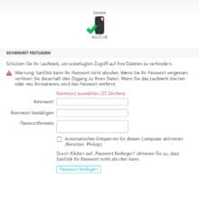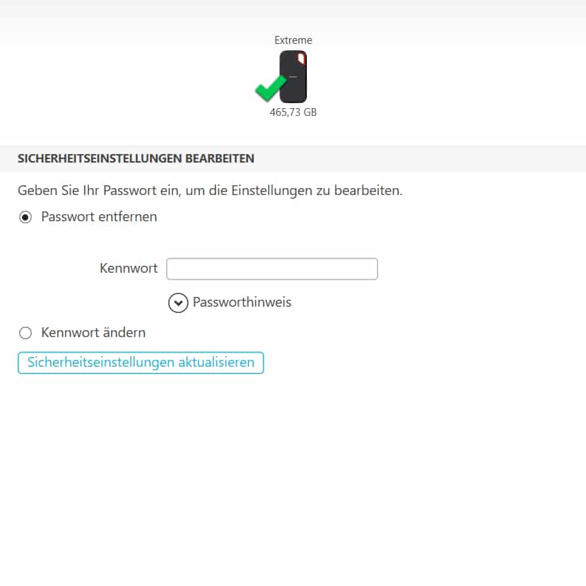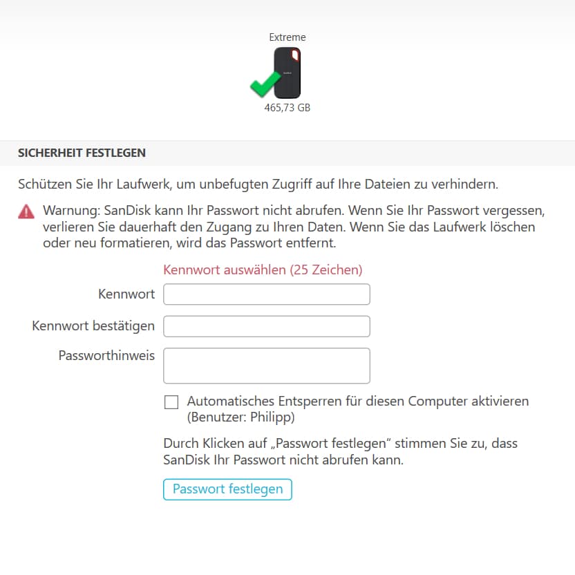 Im Lieferumfang befinden sich ein kurzes USB-C-auf-USB-C-Kabel und ein USB-C-auf-USB-A-Adapter. Zudem befindet sich auf der SSD die SanDisk Security-Software, mit deren Hilfe man die externe SSD mit einem Passwort schützen kann. Das Programm ist simpel und selbsterklärend gestaltet. Nach der Installation startet man das Programm, legt ein Passwort fest (ein Passworthinweis kann ebenfalls angegeben werden) und bestätigt dieses nun. Anschließend ist ein Zugriff auf die Daten nur noch nach Eingabe des Passwortes möglich. Um die Nutzung am eigenen PC zu vereinfachen und auch zu beschleunigen ist ein automatisches Entsperren für euer Benutzerkonto möglich.