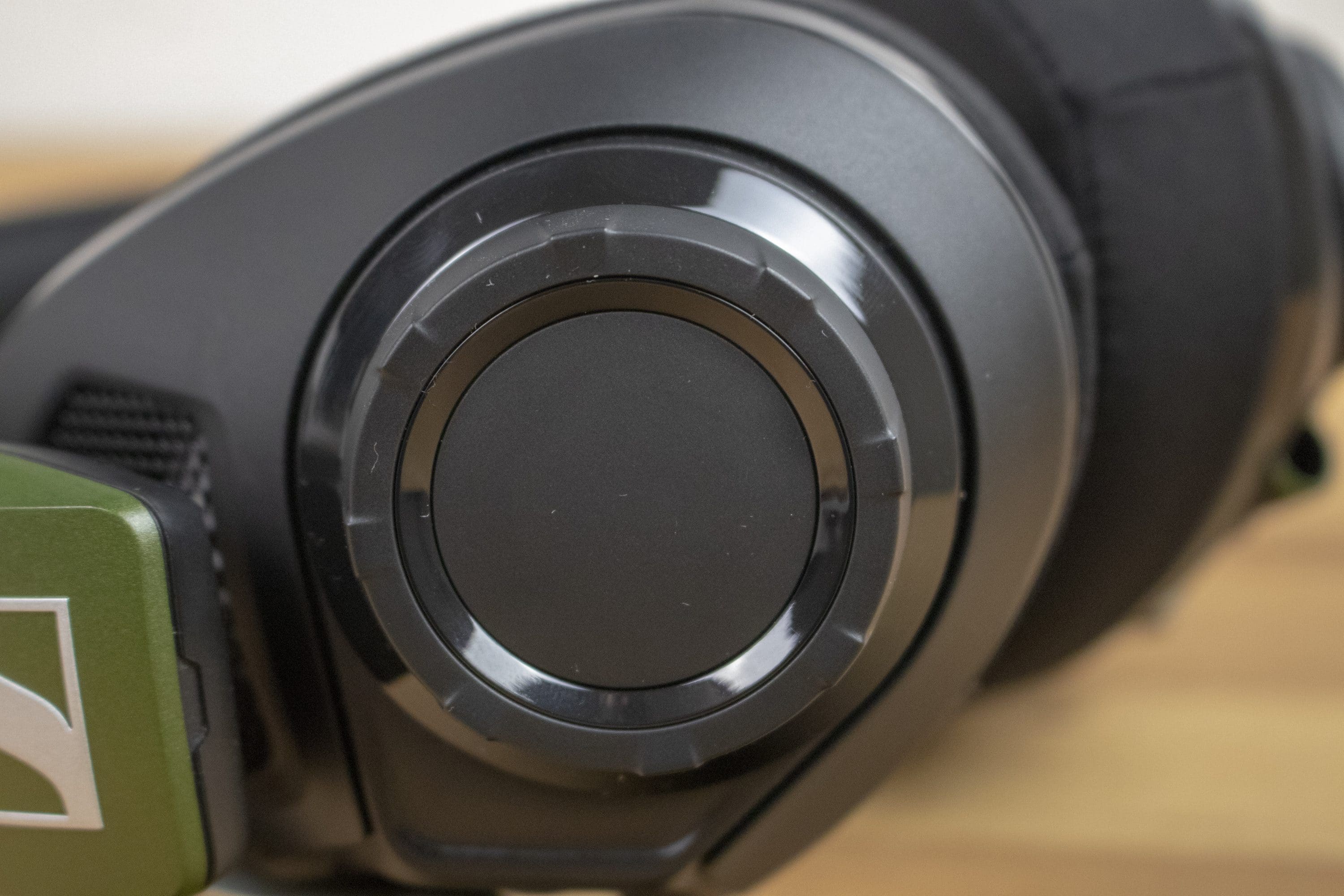 Im Kabel findet sich eine Inline-Steuerung zur Aktivierung oder Deaktivierung des Dolby-Sounds. Außerdem kann die Lautstärke direkt über ein Drehrad an der rechten Ohrmuschel gesteuert werden. Das Drehrad ist stufenlos, was uns gut gefällt. So hört man beim Verstellen kein Klacken im Ohr. Es ist jedoch relativ schwergängig. Eine Steuerung für das Mikrofon gibt es nicht, allerdings wird es beim Hochklappen automatisch stummgeschaltet. Dies hört man durch ein Klicken.