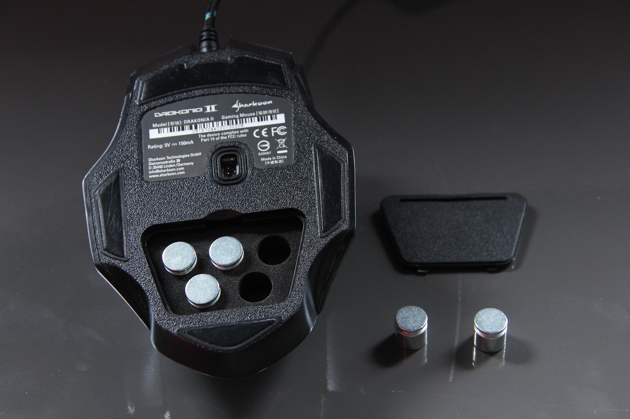 Bei der Verarbeitung wurde auf Kunststoff gesetzt. Das Ergebnis macht einen robusten Eindruck und fühlt sich gut in der Hand an. Der Hersteller verspricht eine Lebensdauer von mindestens zehn Millionen Klicks. Die Tasten haben einen etwas stärkeren Druckpunkt, der aber klar definiert ist. Das Mausrad ist gummiert und lässt sich präzise drehen. Ergonomisch ist die Maus für Rechtshänder ausgelegt. Die Seitenteile sind zwar texturiert, um griffiger zu sein, trotzdem fühlt sich die Maus eher glatt an. Praktisch ist das anpassbare Gewicht der Drakonia II. Das normale Gewicht beläuft sich auf etwa 135 Gram, womit die Drakonia II zu den schwereren Vertretern unter den Gaming-Mäusen zählt. Dies lässt sich durch fünf einzeln herausnehmbare Gewichte anpassen. Ohne Gewichte wiegt die Maus nur noch ca. 107 Gramm.