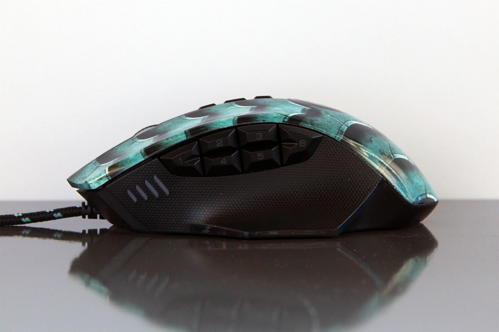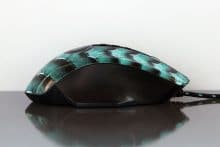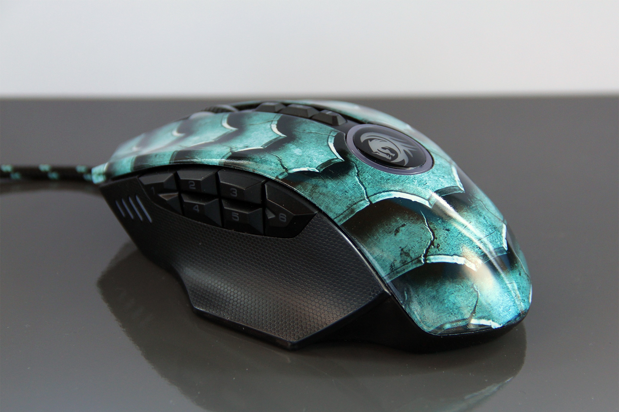 Ausgestattet ist die Drakonia II mit insgesamt zwölf Tasten. Linke und rechte Maustaste, Mausrad, zwei DPI-Einstelltasten und eine Schnellfeuertaste befinden sich auf der Oberseite und weitere sechs Zusatztasten an der linken Seite. Das Kabel ist farblich passend textilummantelt und etwa 1,80m lang. Zusätzlich liegt eine kleine Transporttasche und ein Set mit Ersatz-Mausfüßen bei.