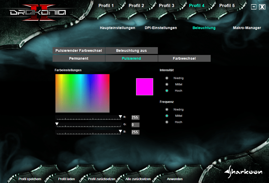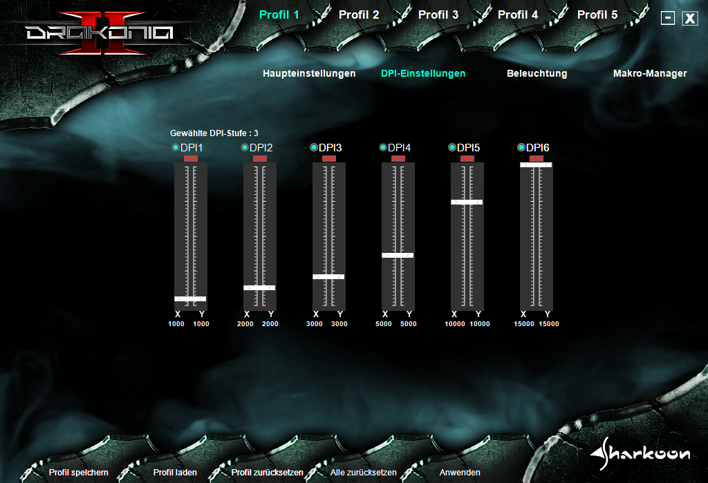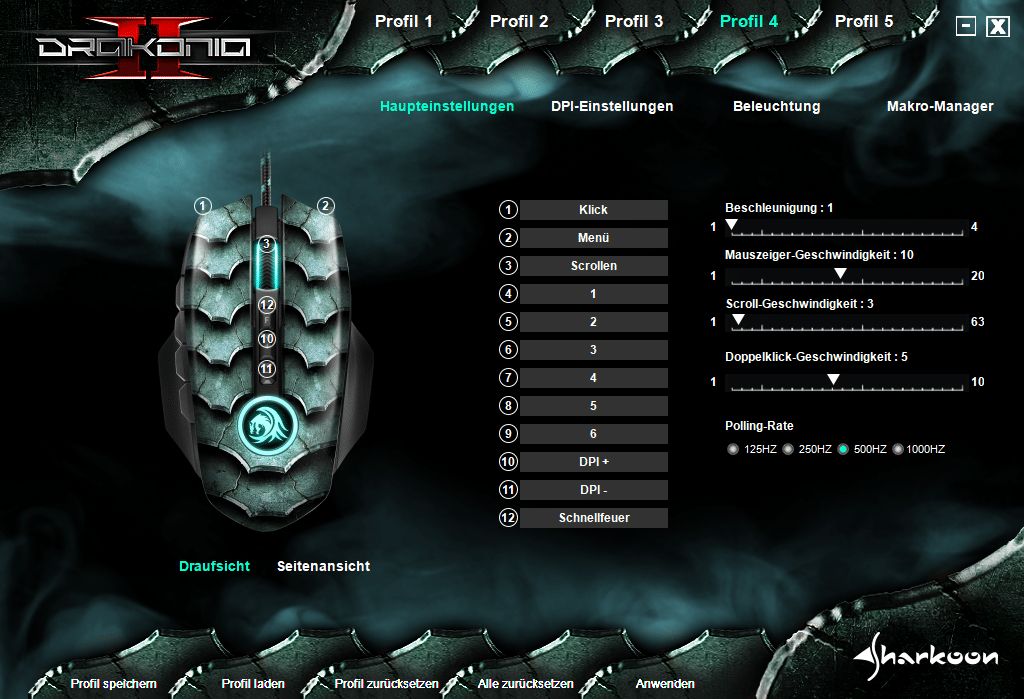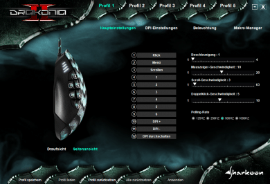 Fünf Profile können in der Maus abrufbereit gespeichert werden. Weitere Profile können abgespeichert und bei Bedarf geladen werden. Für jedes Profil kann die Tastenbelegung, DPI-Stufen, Beleuchtung und das Mausverhalten einzeln angepasst werden, sodass man für verschiedene Spiele passende Profile anlegen kann. Alle zwölf Tasten sind individuell belegbar und auch der Schnellfeuer-Befehl lässt sich konfigurieren. Die Abtastrate kann auf 125 Hz, 250 Hz, 500 Hz oder 1000 Hz festgelegt werden. Die DPI-Stufen lassen sich zwischen 100 und 15.000 einstellen. Außerdem ist ein Makro-Manager vorhanden. Die RGB-Beleuchtung kann ebenfalls angepasst werden. Die Drakonia II kann wahlweise einfarbig, im Farbwechsel, pulsierend, durchgängig oder gar nicht leuchten.