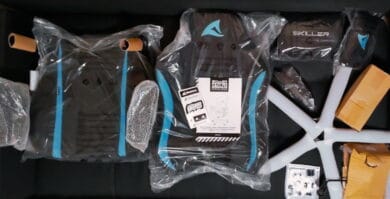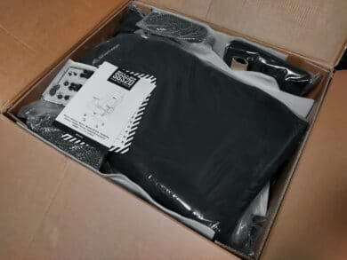 Der Gaming-Chair wurde in einem rund 22 kg schweren Paket geliefert, was für gängige Modelle in etwa dem Standardgewicht entspricht. Der Karton, indem der Stuhl auf den Versandweg geschickt wird, ist sehr stabil, auch wenn das im ersten Moment vielleicht nicht so aussieht, da dieser während des Transports doch einige Katscher und Dellen abbekommen hat. Im Anschluss, nach dem Aufbau, hatten wir allerdings tatsächlich Probleme damit, diesen für die Entsorgung in tonnengerechte Häppchen zu zerlegen. Auf der Verpackung selbst gibt der Hersteller die wichtigsten Informationen zum Produkt an. So auch die Farbe, die dementsprechend durch einen farbigen Punkt gekennzeichnet wird. Unser Sharkoon SKILLER SGS20 Fabric sollte den Farbton Blau-Schwarz haben. Zusätzlich ist das sportliche Duo-Tone-Modell jeweils in der Grundfarbe Schwarz mit einem Akzent (Orange, Grau oder Rot) erhältlich.