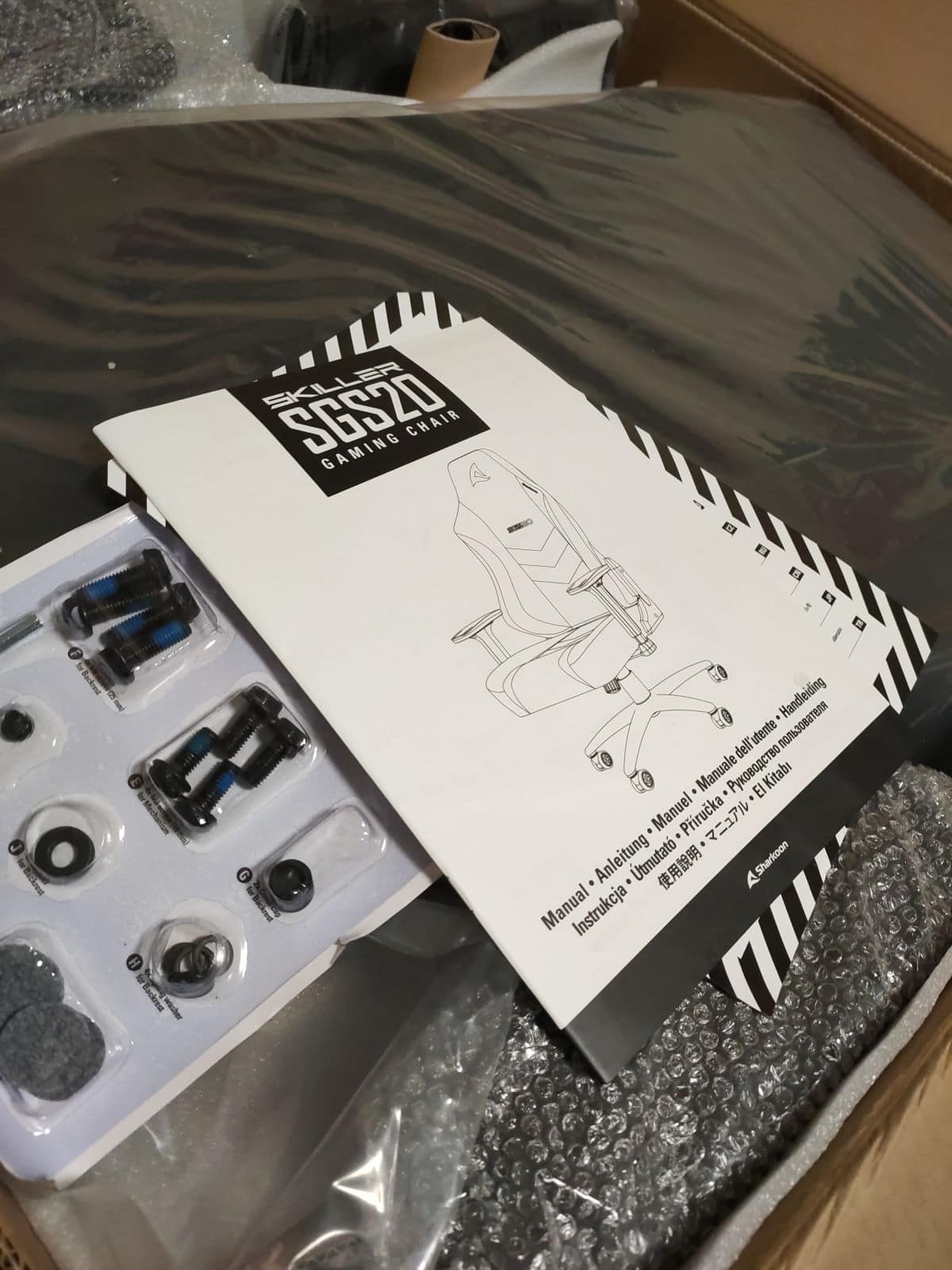 Vorweg können wir sagen, dass sich der Aufbau des Sharkoon SKILLER SGS20 relativ intuitiv gestaltet. Wer an dieser Stelle jedoch lieber auf die Anleitung zurückgreifen möchte, wird auch damit nicht enttäuscht sein. Jeder einzelne Schritt ist bestens erklärt und bebildert, sodass sich der Aufbau kinderleicht gestaltet. Das können wir beurteilen, weil wir einen etwas kniffligeren Arbeitsschritt auch nachschlagen mussten und binnen Sekunden herausgefunden haben, wie es geht. Außerdem findest du in der Anleitung Sicherheitshinweise darüber, was du mit dem Stuhl nicht machen solltest, um dich selbst nicht zu verletzen und die Langlebigkeit zu bewahren.