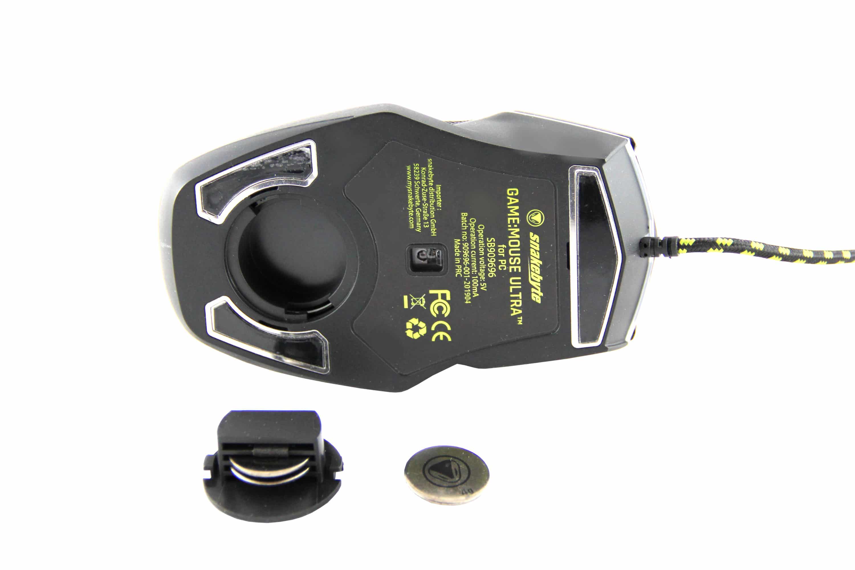 Darüber hinaus befinden sich in der Maus drei Gewichte, die je 4 Gramm wiegen und sich beliebig rausnehmen lassen. Das Gewicht variiert somit zwischen 125 Gramm und 137 Gramm. Auf der Unterseite der Maus finden sich Gleitelemente, die den Widerstand der Maus entsprechend beeinflussen und sich beliebig entfernen lassen. Die Maus lässt sich auf bis zu 50G beschleunigen. Auf dem Mauspad gleitet sie einwandfrei, auf Holz ist sie etwas schneller unterwegs aber trotzdem problemlos zu verwenden.