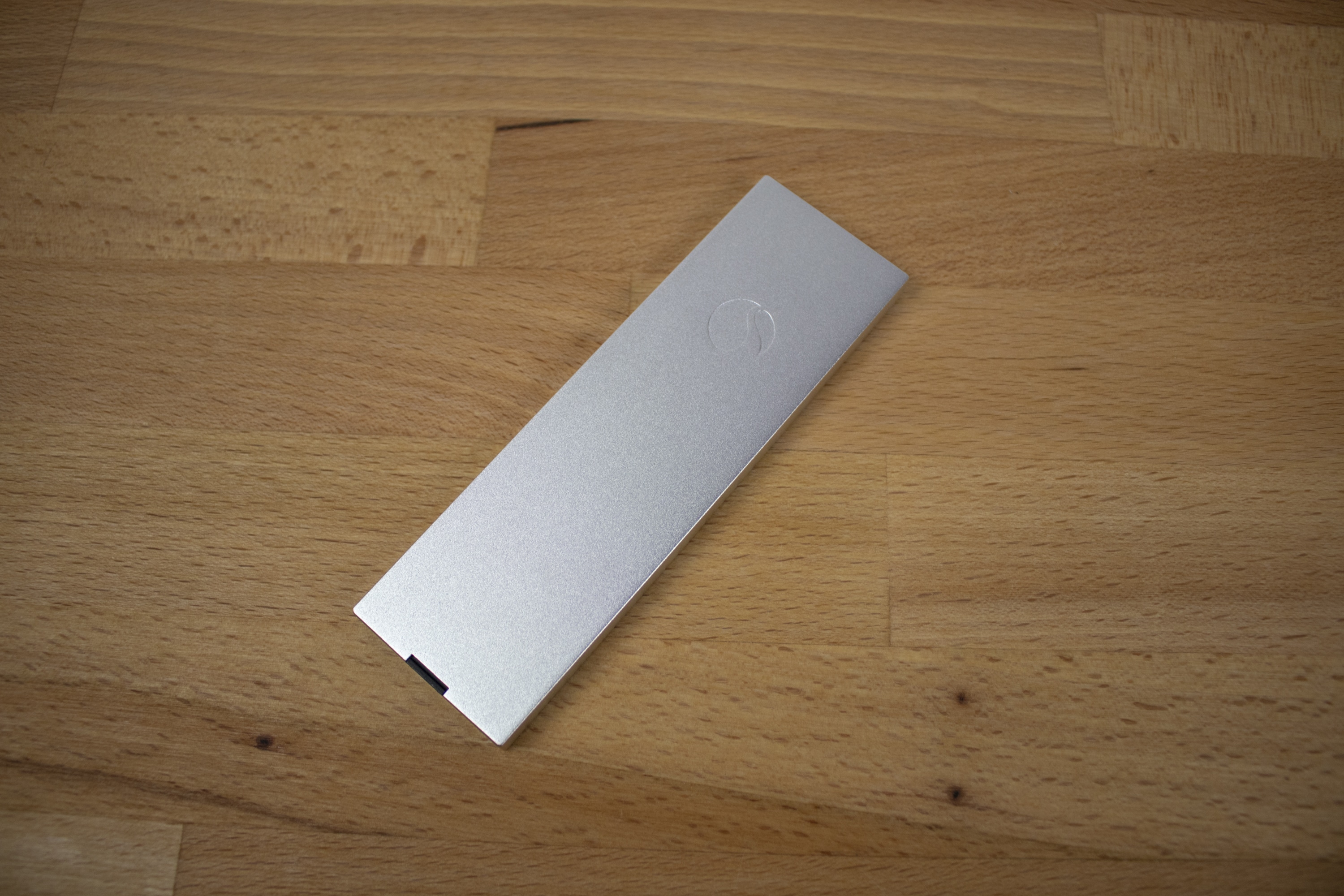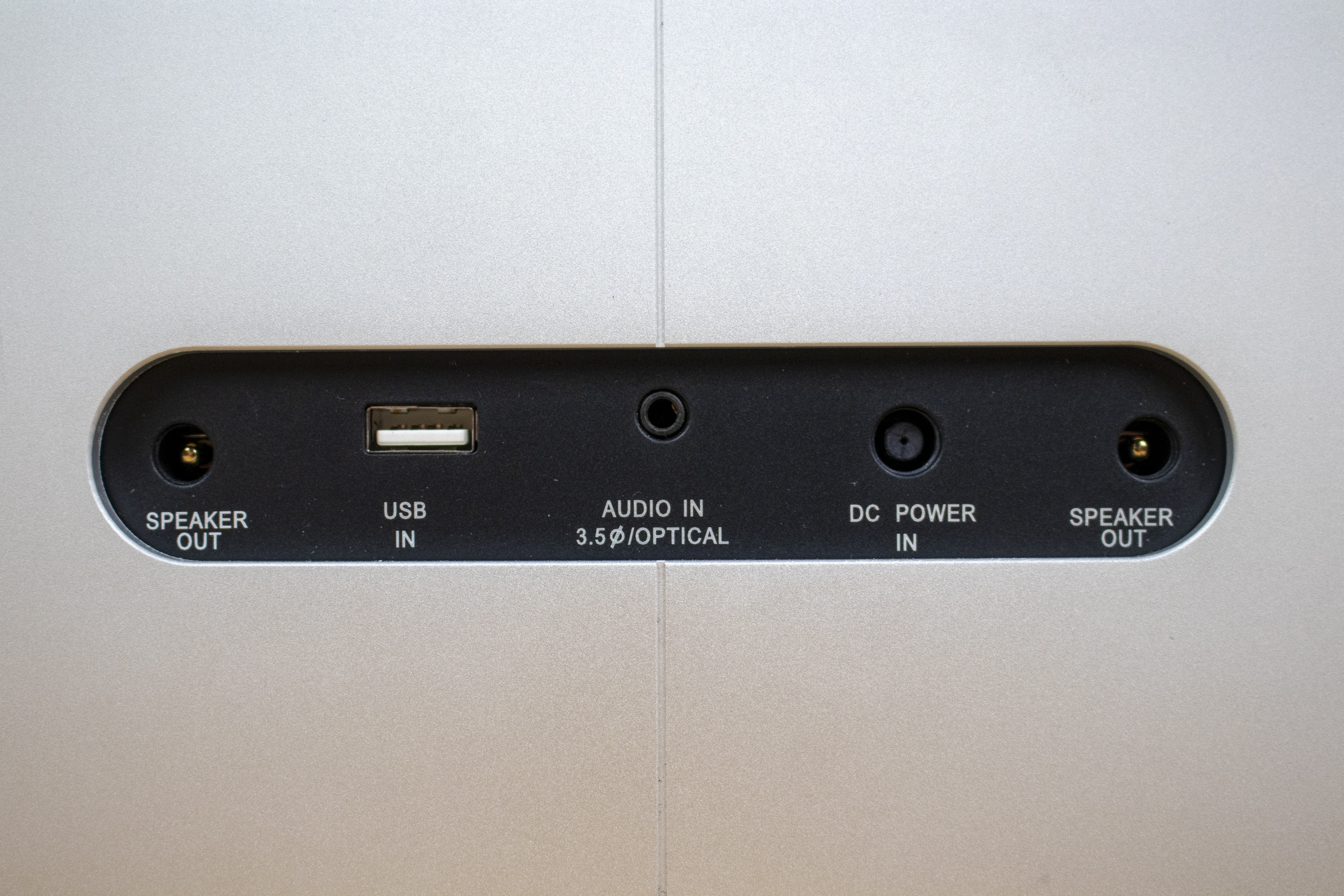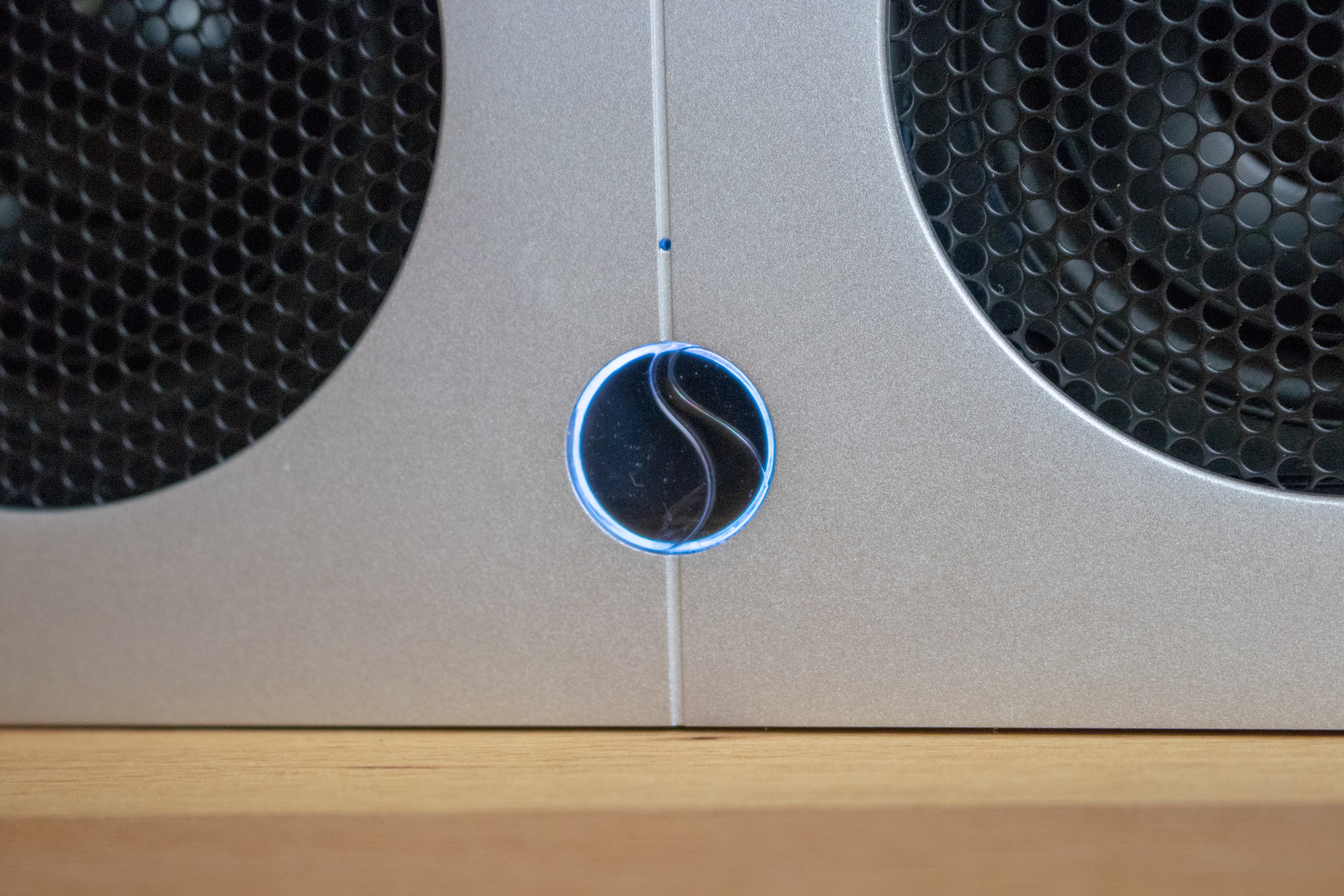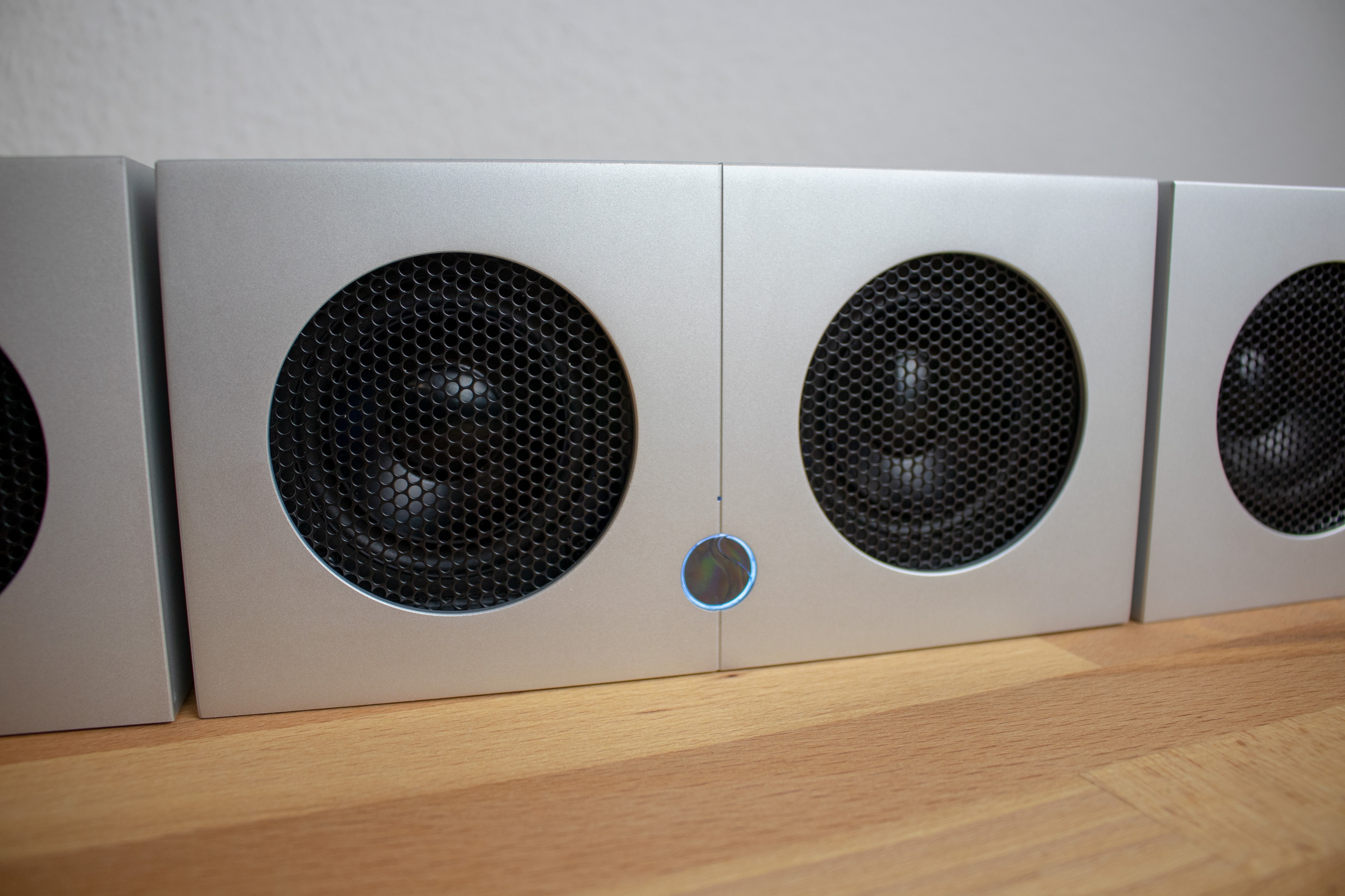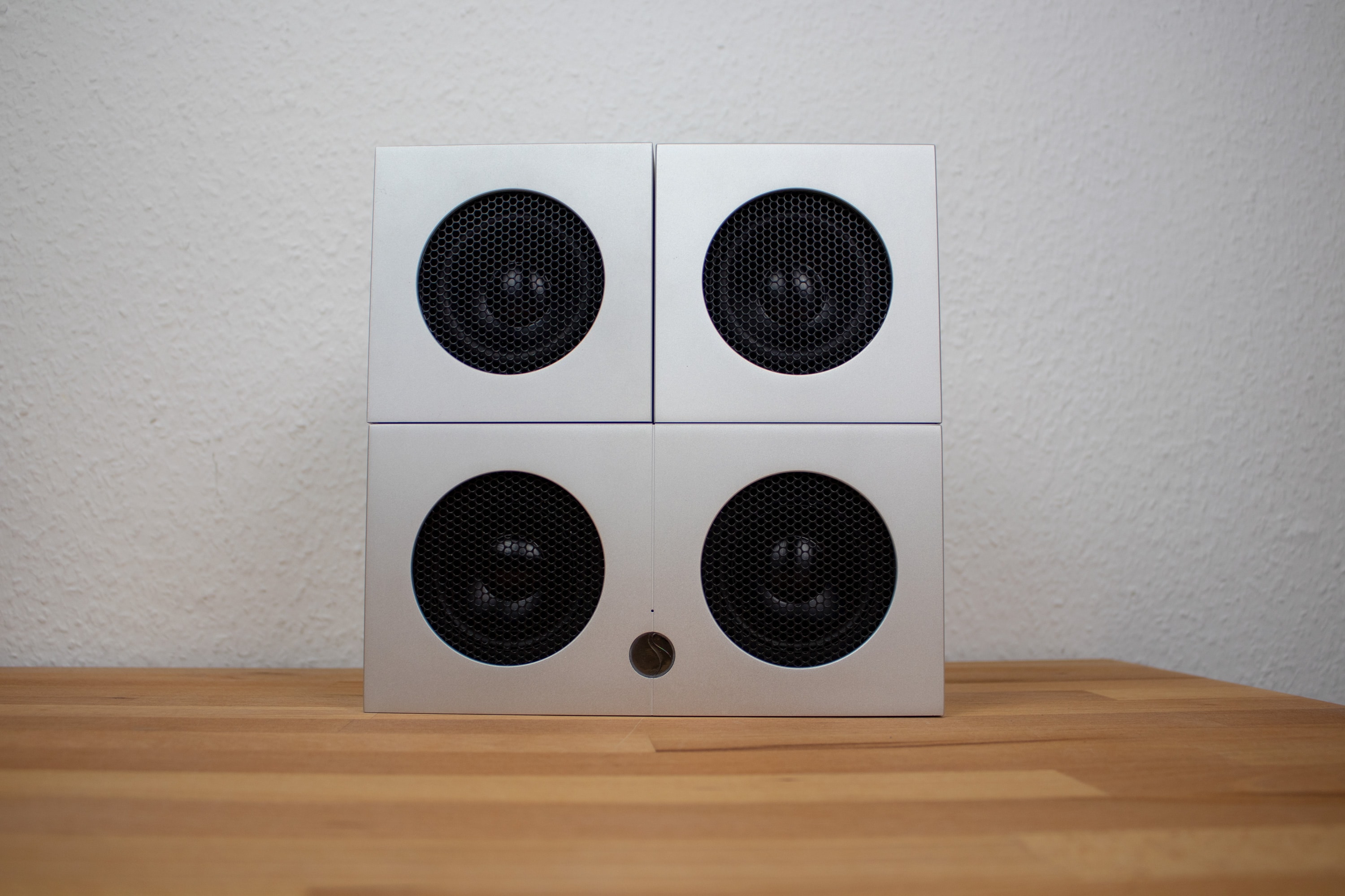 An der Oberseite der einzelnen Module ist das Logo des Herstellers in das Material gepresst. Auf den ersten Blick fällt es kaum auf, da es farblich nicht hervorgehoben ist. Auch in diese Hinsicht wird das auffällig-unauffällige Design also konsequent beibehalten. Rückseitig finden sich im Übrigen Anschlussmöglichkeiten, während vorderseitig die Ausgabe des Tons erfolgt.