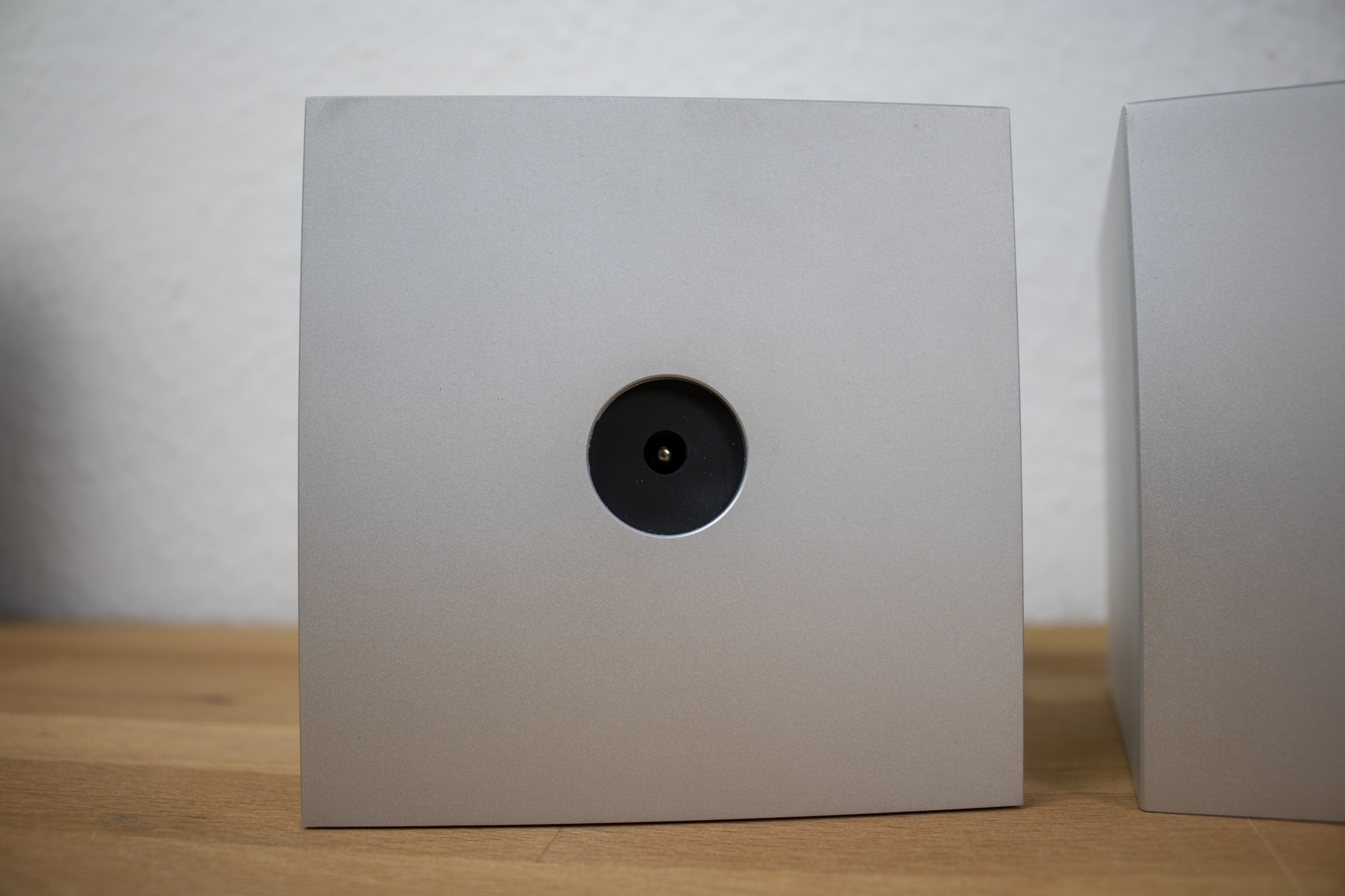 Gefertigt sind sowohl die Satelliten-Würfel als auch der Subwoofer aus je einem Stück Aluminium. Die einzelnen Module sind trotz ihrer vergleichsweise geringen Größe also relativ wuchtig und unflexibel – jedoch nicht hinsichtlich der sich bietenden Aufstellmöglichkeiten. Das Gewicht von 1,22 Kilogramm pro Satellit und 2,79 Kilogramm für den Subwoofer ist bezogen auf die Größe der Einzelteile hoch. An dieser Stelle seien die Maße dann auch einmal angeführt: Die beiden Satelliten messen 116 x 116 x 116 Millimeter, während das Subwoofer-Modul Maße von 232 x 116 x 116 Millimetern aufweist.