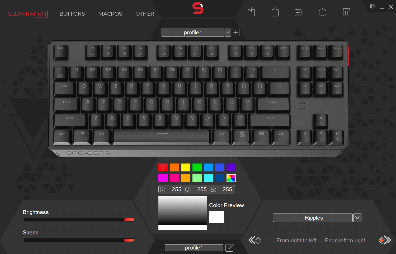 SPC Gear hat für die GK630K auch eine Software parat. Diese finden wir auf der Hersteller-Seite. Über sie kann die vorhandene RGB-Beleuchtung angepasst werden. Leider kann nicht jede LED einzeln angesteuert werden, es gibt nur vorgefertigte Effekte, dafür aber eine ganze Menge.