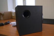 Subwoofer und Satteliten-Lautsprecher kommen in matt-schwarzer Farbgebung daher, die mit einer strukturierten Oberfläche durchaus edel anmutet. Der wuchtige Subwoofer kommt auf Abmessungen von 261 × 259 × 263 mm (Breite x Höhe x Tiefe) und ein Gewicht von knapp vier Kilogramm.