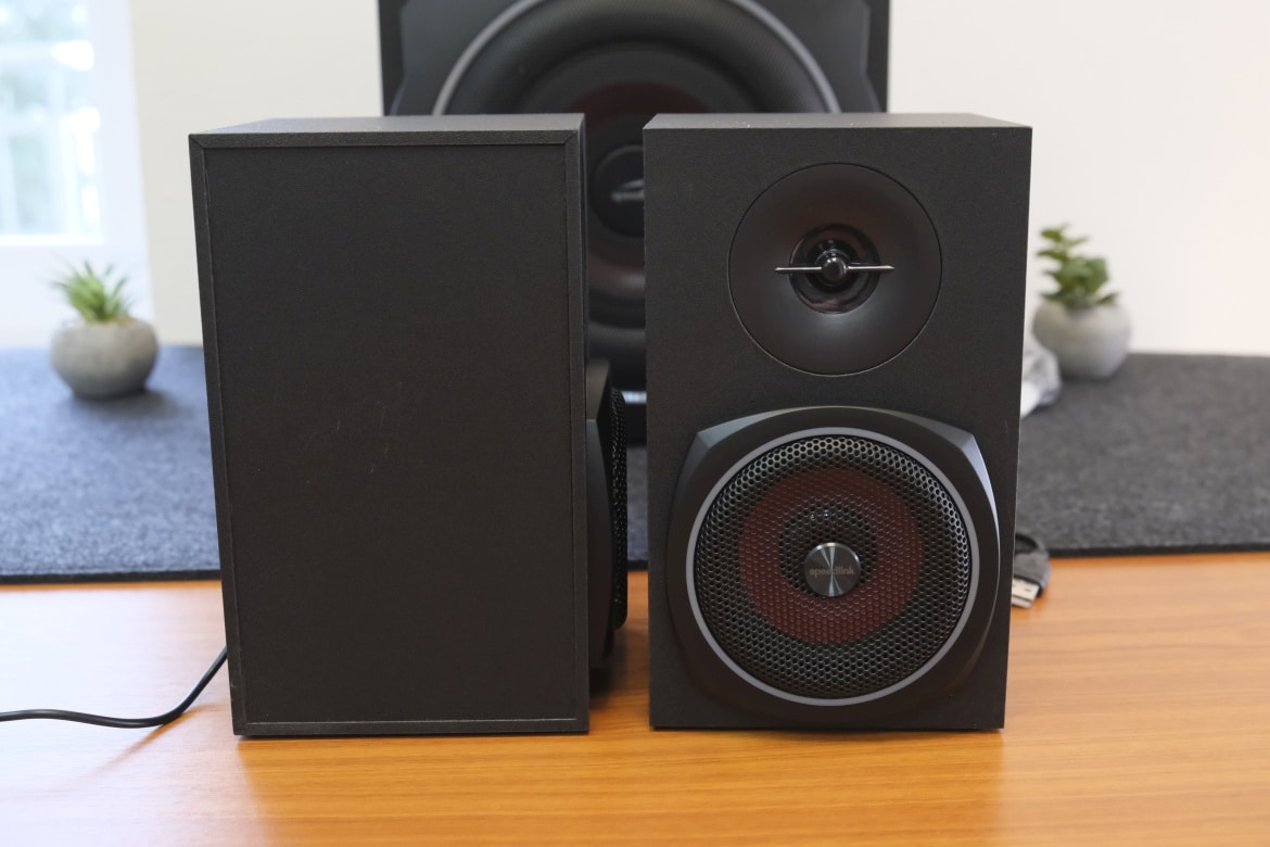 Die beiden Satelliten sind 108 × 182 × 119mm (B × H × T) groß und orientieren sich hinsichtlich des Designs am Subwoofer. Bedienelemente oder abnehmbare Kabel weisen sie hingegen nicht auf. Lediglich das fest verbaute USB-A-Kabel an der jeweiligen Rückseite ermöglicht eine Verbindung.