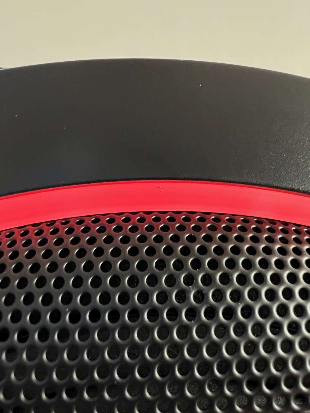 An der Vorderseite scheint die rote Klangmembran durch, die hinter einem Gitter fast die gesamte Front einnimmt. In der Mitte befindet sich noch einmal das Hersteller-Logo, während die Front von einem halb-transparenten Ring eingerahmt wird. Dieser ist im eingeschalteten Zustand für die RGB-Beleuchtung zuständig.