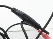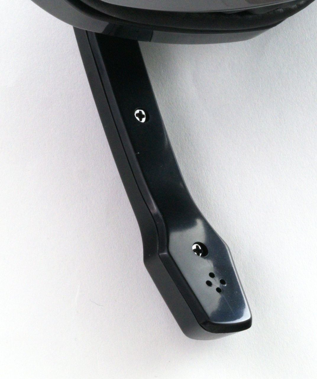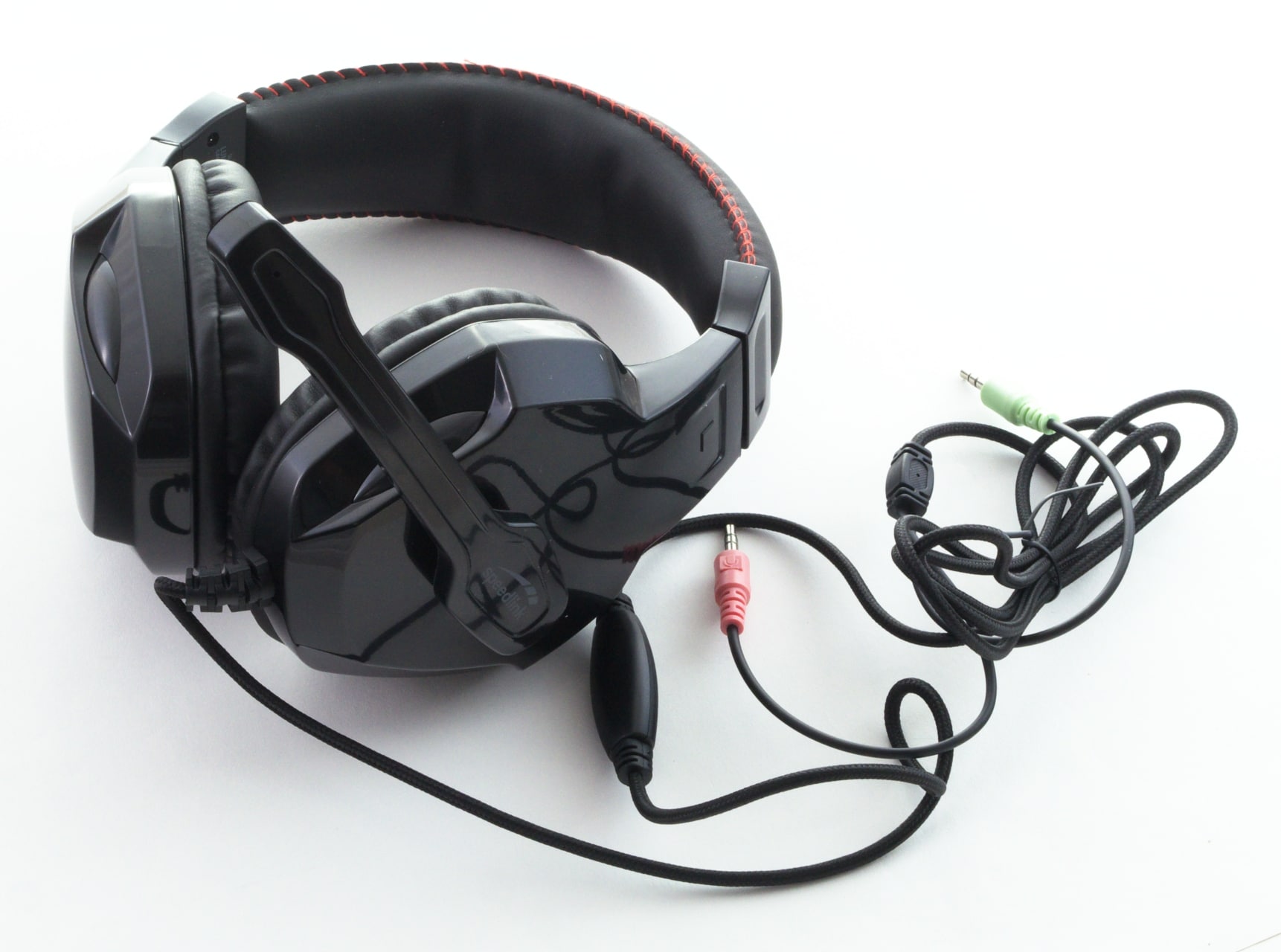 Am linken Hörer befinden sich sowohl als ausklappbare Mikrofon als auch das fest installierte und gesleevte Anschlusskabel. Dieses verfügt wiederum über eine einfache Lautstärkeregelung über ein Potentiometer und über zwei dreipolige Klinkenstecker. Ohne zusätzlichen Adapter kann das Headset somit an Desktop-PCs, nicht aber an Notebooks oder Smartphones verwendet werden.