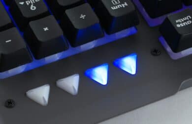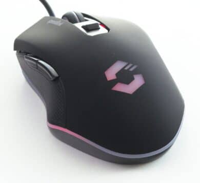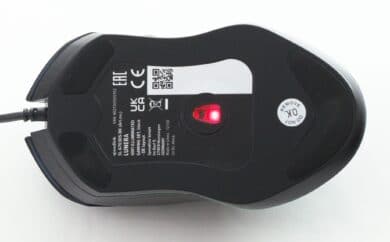 Die Druckpunkte der verbauten Tasten sind gut: Zwar lässt sich die Zurück-Taste gefühlt etwas weiter drücken als die Vorwärts-Taste, doch war das für den Preis auch nicht anders zu erwarten. Dasselbe gilt auch für die Beleuchtung und den verbauten Sensor: Erstere ist aufgrund nur weniger LEDs nicht gerade homogen, und der Sensor mit 800 bis 3.200 DPI alles andere als ein High-End-Modell. Spielen kann man mit dem Sensor aber trotzdem. Im Kopf behalten sollte man aber das dauerhaft aktivierte Angle-Snapping. Ob dieses positiv oder negativ auffällt ist schlicht Geschmackssache.